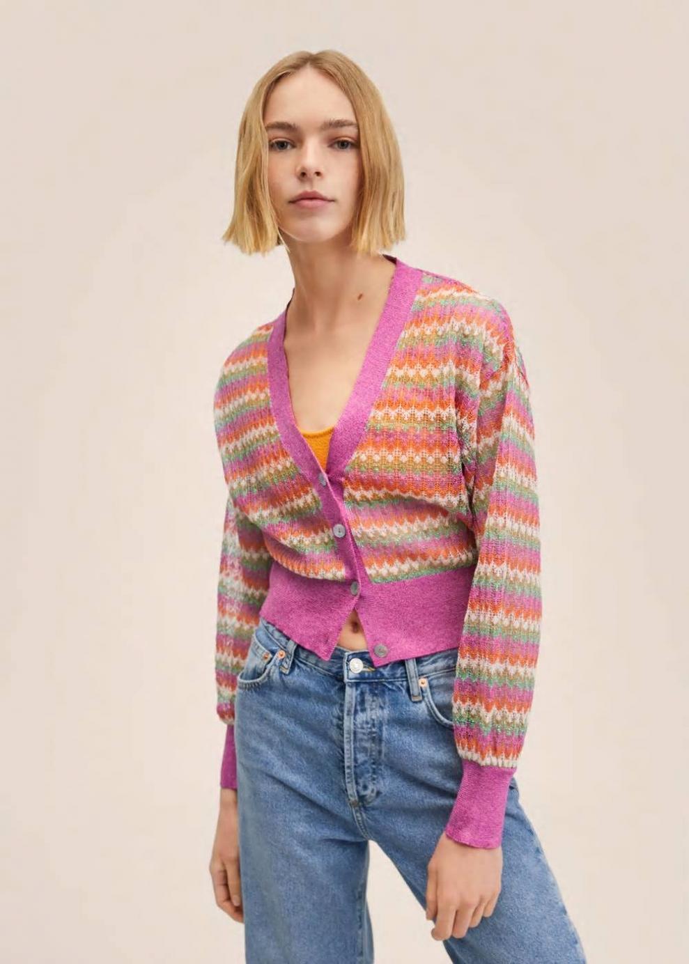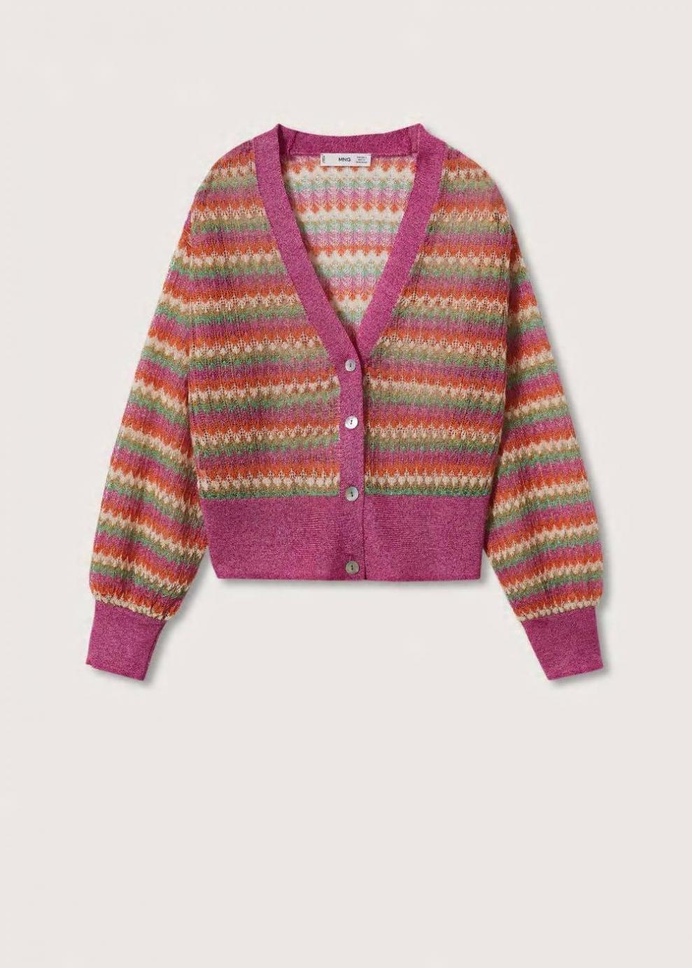 Tejido de punto fino Estampado de rayas Diseño recto Diseño semitransparente Cuello pico Manga larga Cierre delantero Disponible Plus…