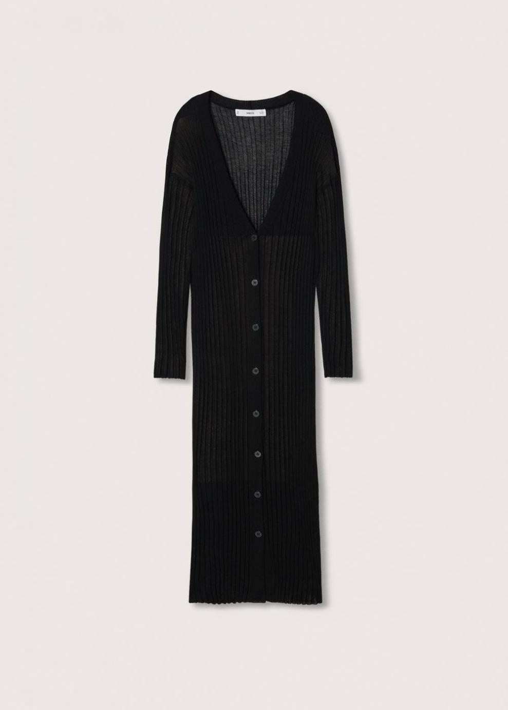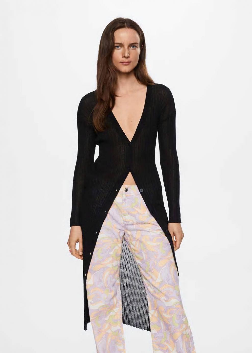 Colección Committed Tejido de punto fino Tejido de canalé Diseño entallado Diseño largo Diseño semitransparente Cuello pico Manga larga Cierre de botones en la parte delantera Las prendas etiquetadas como Committed son productos que han sido confeccionadas con fibras y/o procesos de producción sostenible, reduciendo así su impacto ambiental. El objetivo de Mango es respaldar la implementación de prácticas más comprometidas con el medio ambiente, aumentando así, el número de prendas sostenibles en su colección.