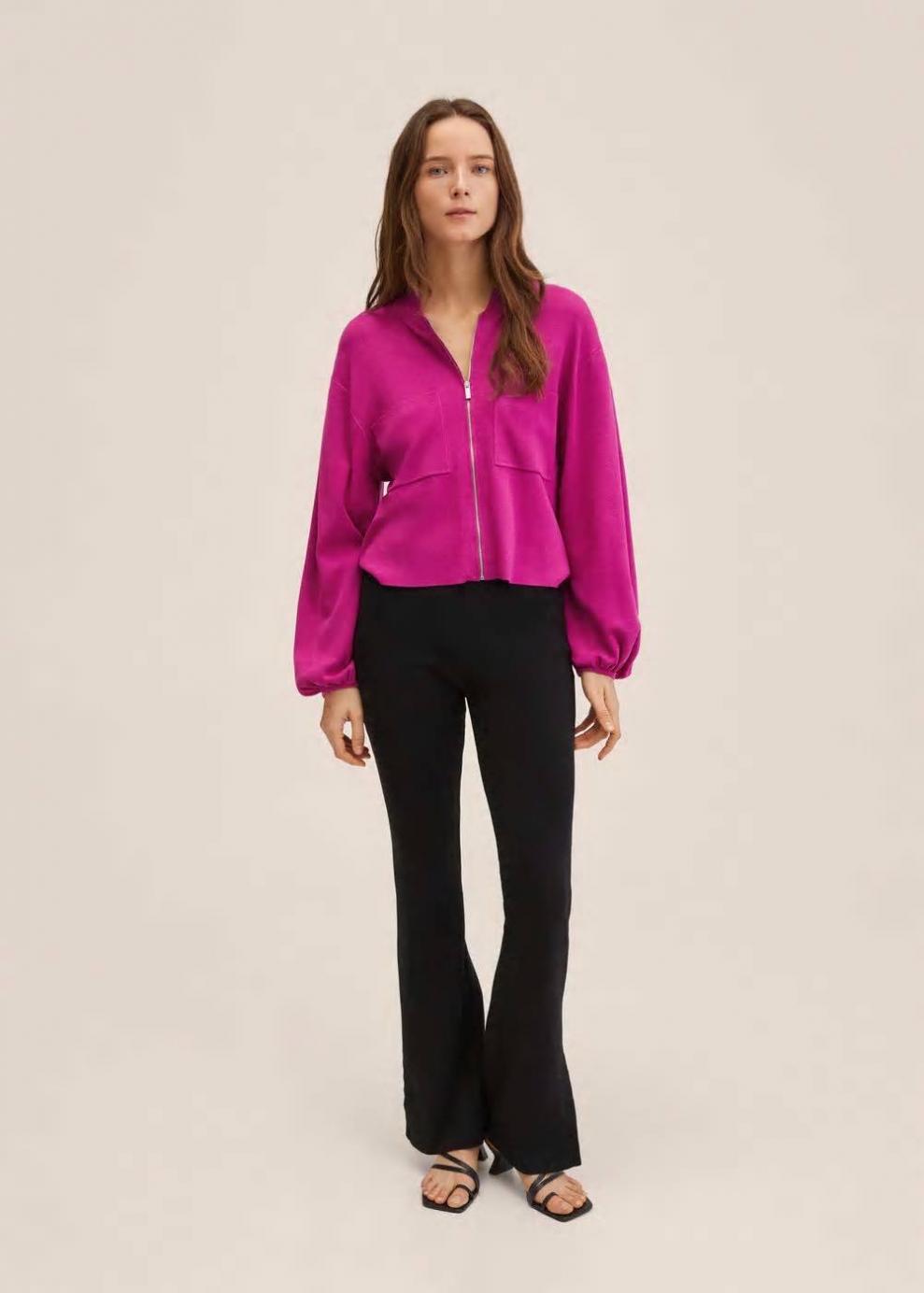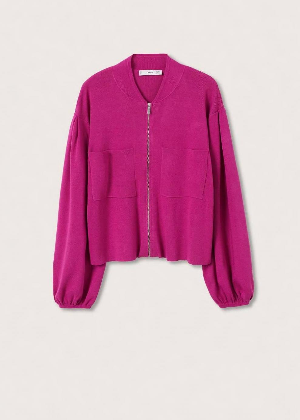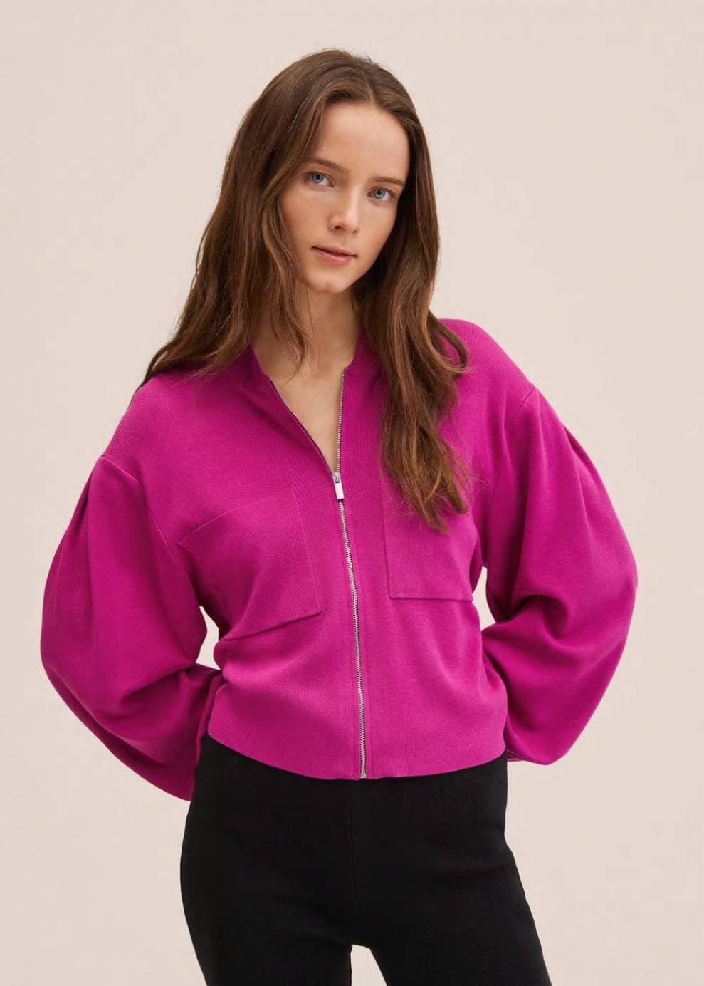 Tejido de punto Diseño recto Manga larga abullonada Cuello perkins con cremallera Dos bolsillos de parche en la parte delantera Cierre de c…