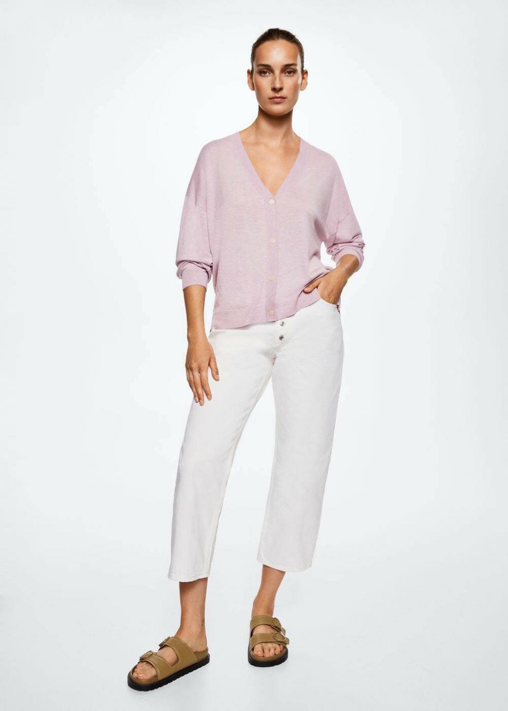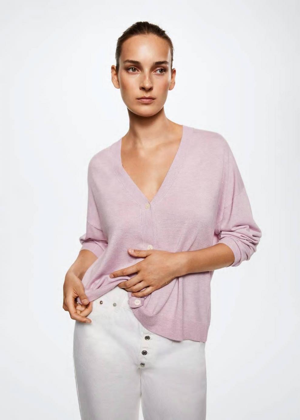 Tejido de punto fino Tejido de cachemira Terminaciones de canalé Diseño recto Cuello pico Manga larga Cierre de botones en la parte delantera Disponible Plus…