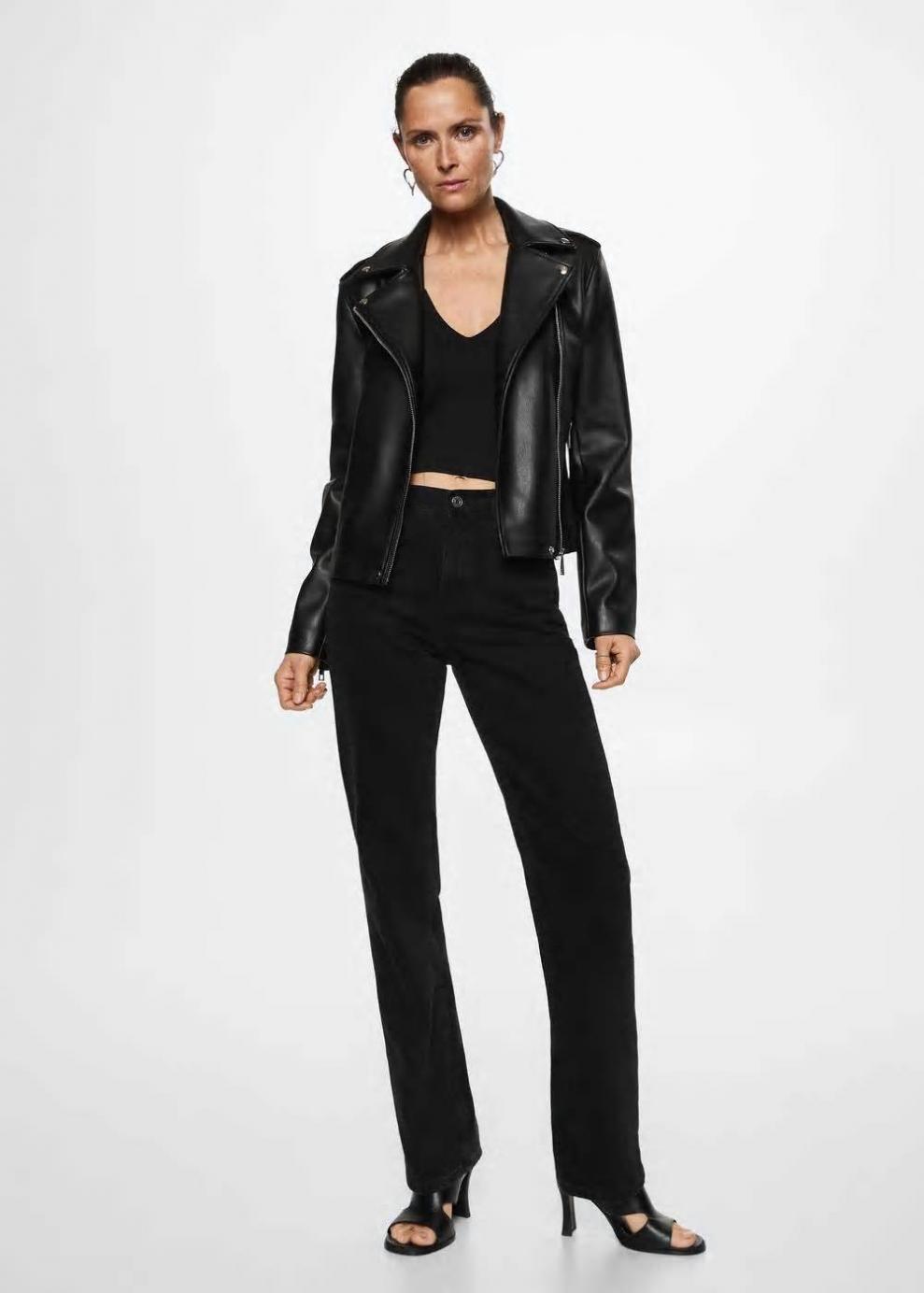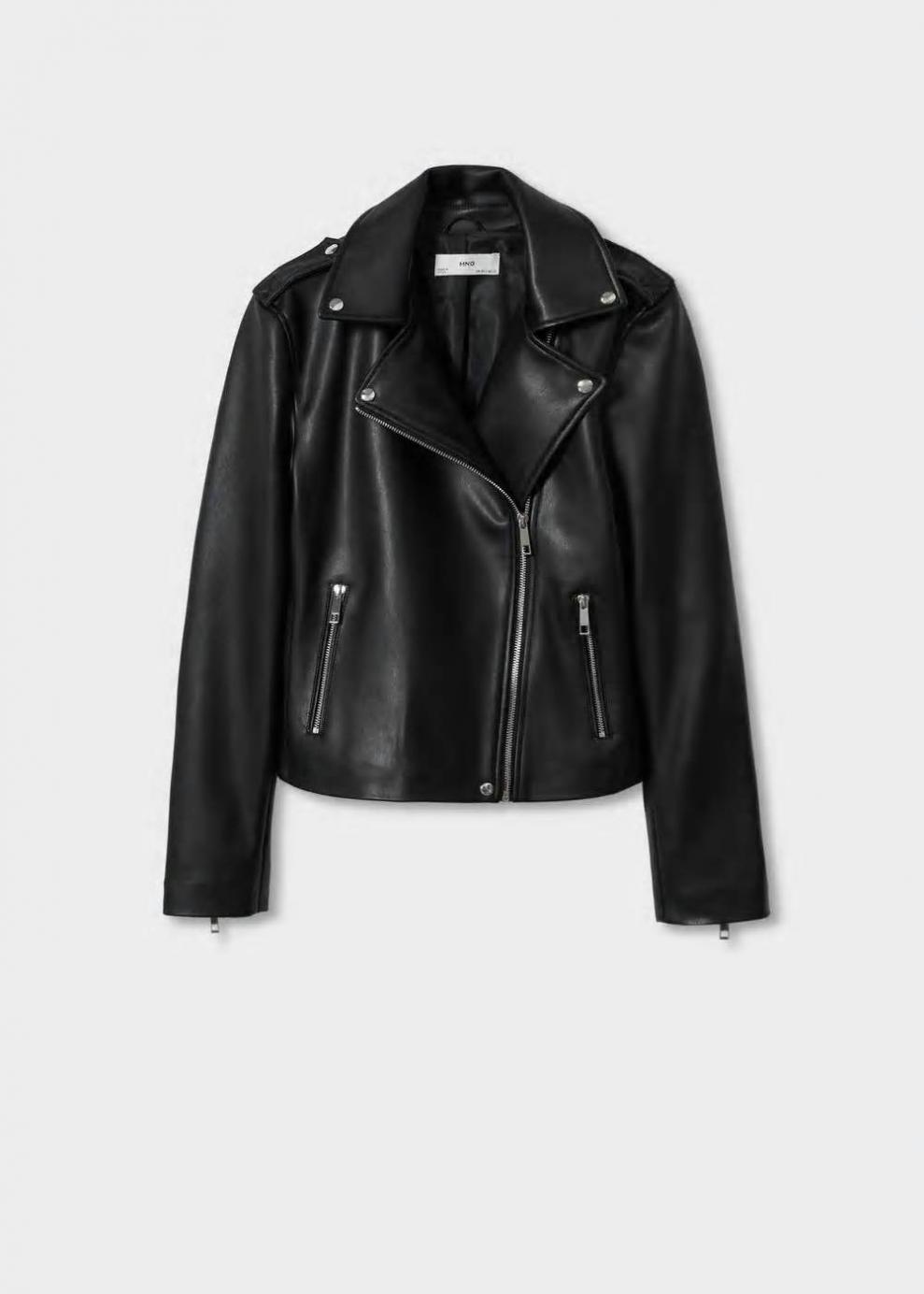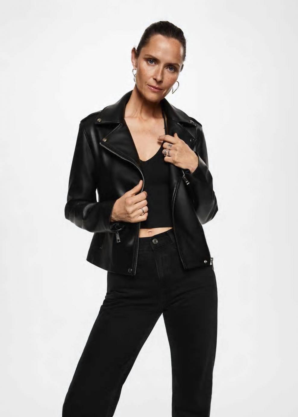 Efecto piel Diseño entallado Diseño corto Cuello de solapa Solapas con muesca Trabillas en los hombros Manga larga Bolsillos de cremallera Forro interior Cierre de cremallera en la parte…