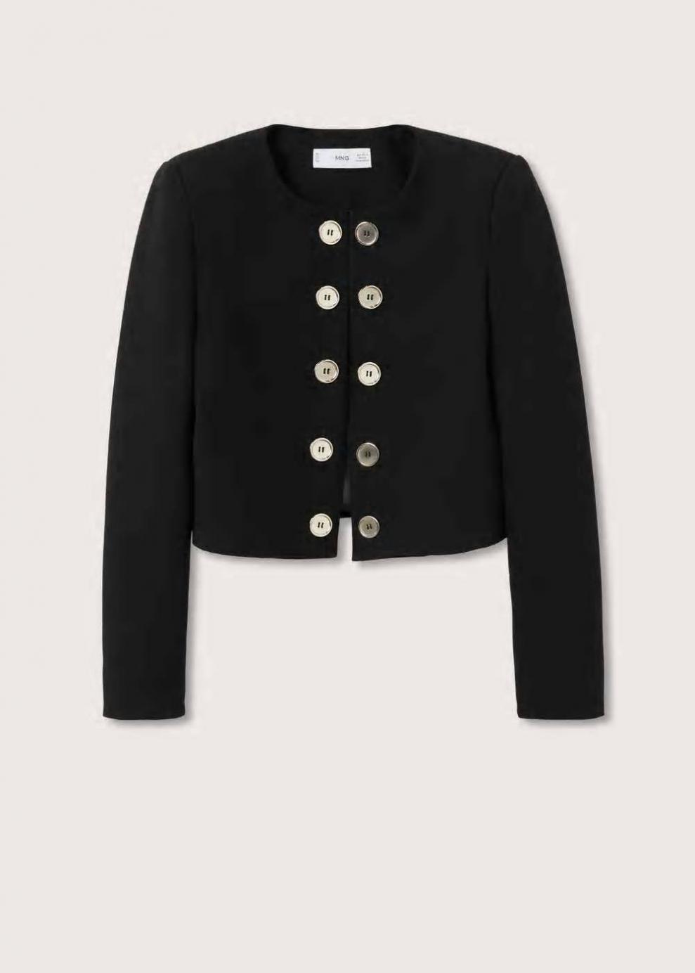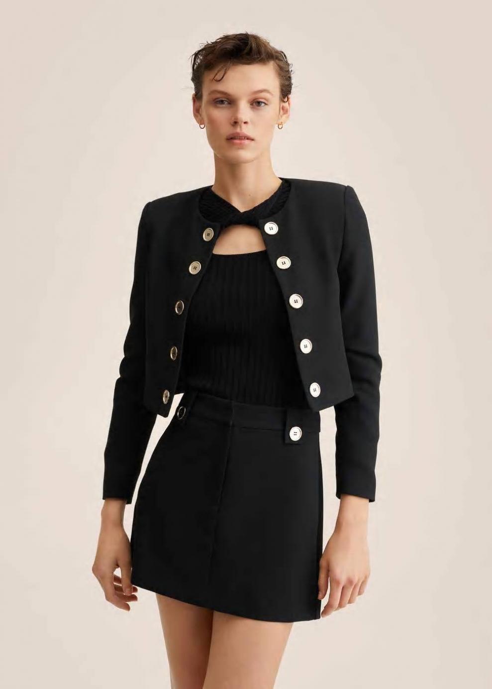 Diseño recto Diseño corto Estilo traje Cuello redondo Manga larga Botones decorativos Sin cierre Forro interior Total look Las prendas etiquetadas como Committed son productos que han sido confeccionadas con fibras y/o procesos de producción sostenible, reduciendo así su impacto ambiental. El objetivo de Mango es respaldar la implementación de prácticas más comprometidas con el medio ambiente, aumentando así, el número de prendas sostenibles en su colección.