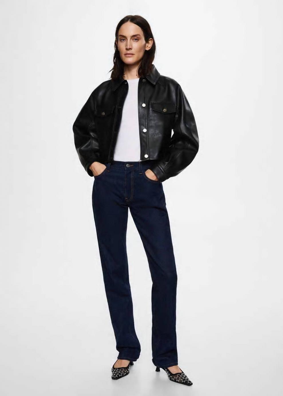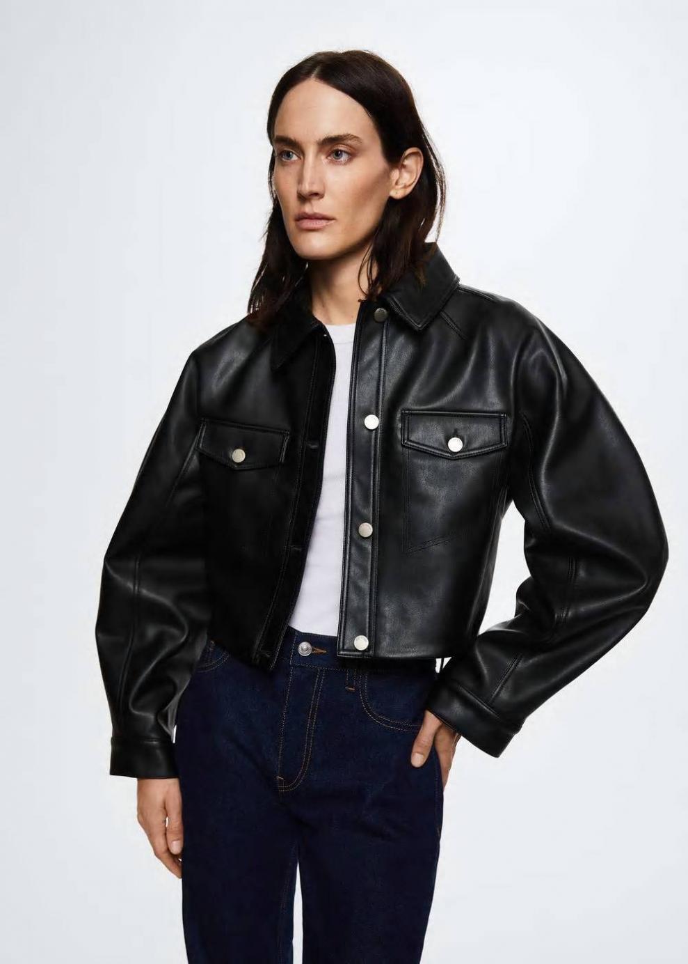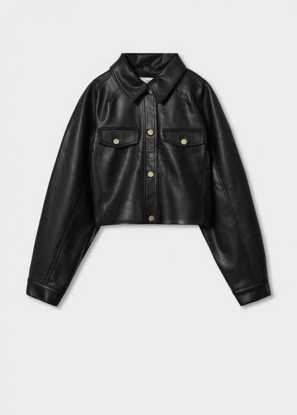 Efecto piel Diseño corto Cuello camisero Cierre de botones a presión en la parte delantera Dos bolsillos de solapa con botón en el pecho Forro interior