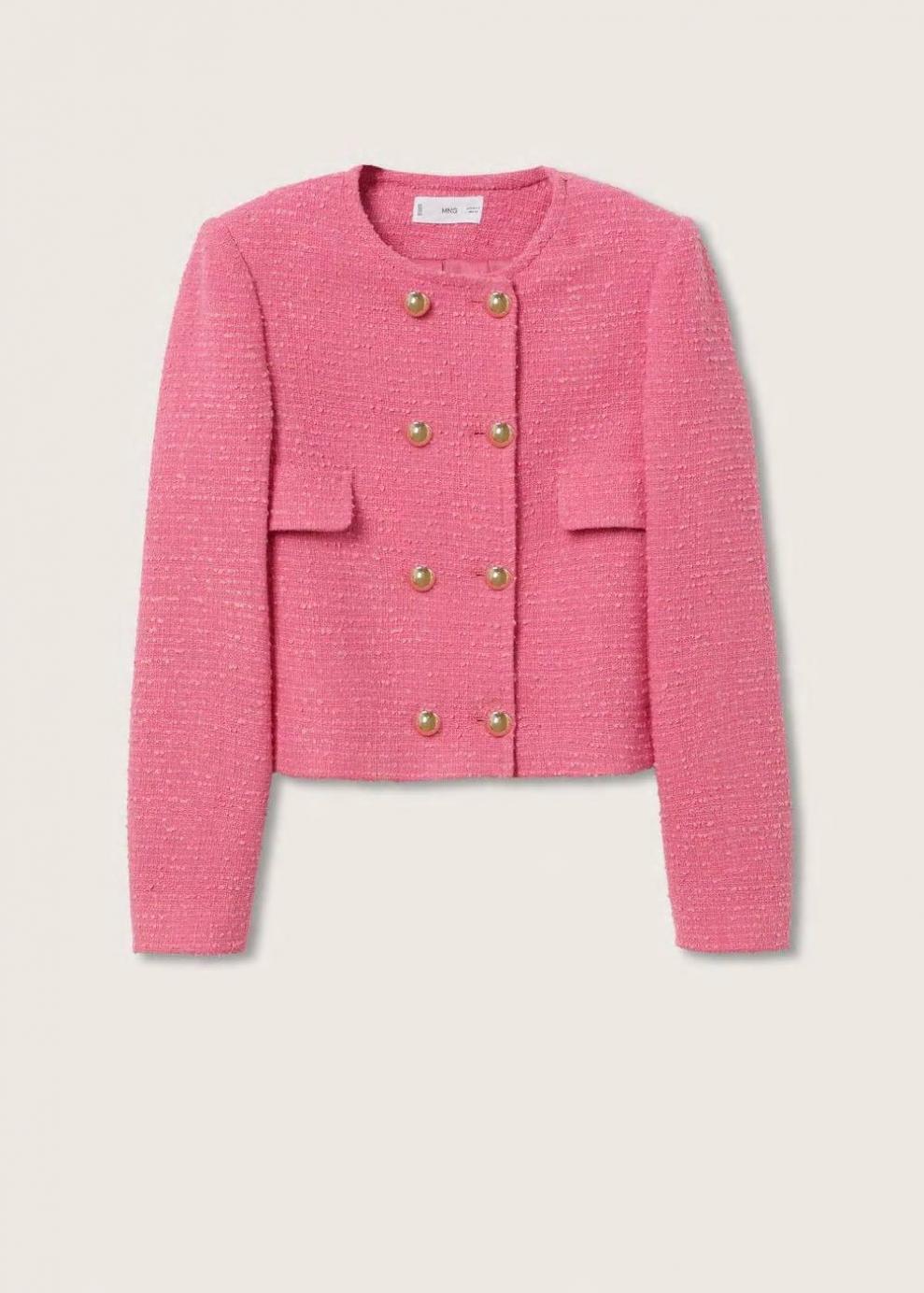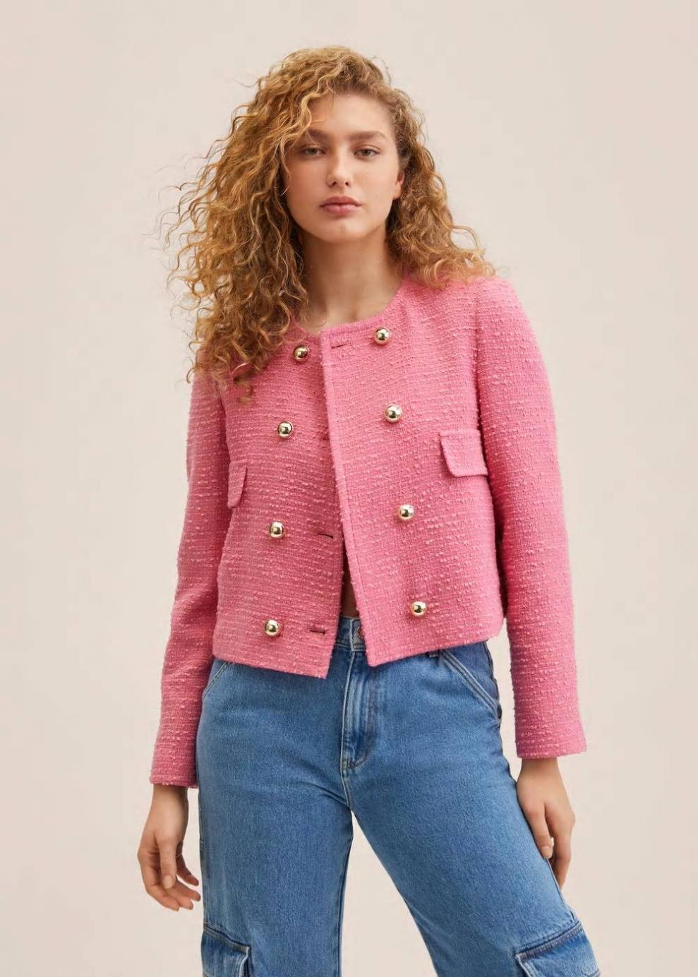 Tejido tweed Tejido mezcla de algodón Diseño recto Diseño estructurado Diseño corto Estilo traje Cuello redondo Manga larga Hombreras Dos bolsillos de solapa en el pecho Forro interior Cierre de doble botonadura Botones efecto joya Total look Disponible Plus Las prendas etiquetadas como Committed son productos que han sido confeccionadas con fibras y/o procesos de producción sostenible, reduciendo así su impacto ambiental. El objetivo de Mango es respaldar la implementación de prácticas más comprometidas con el medio ambiente, aumentando así, el número de prendas sostenibles en su colección.