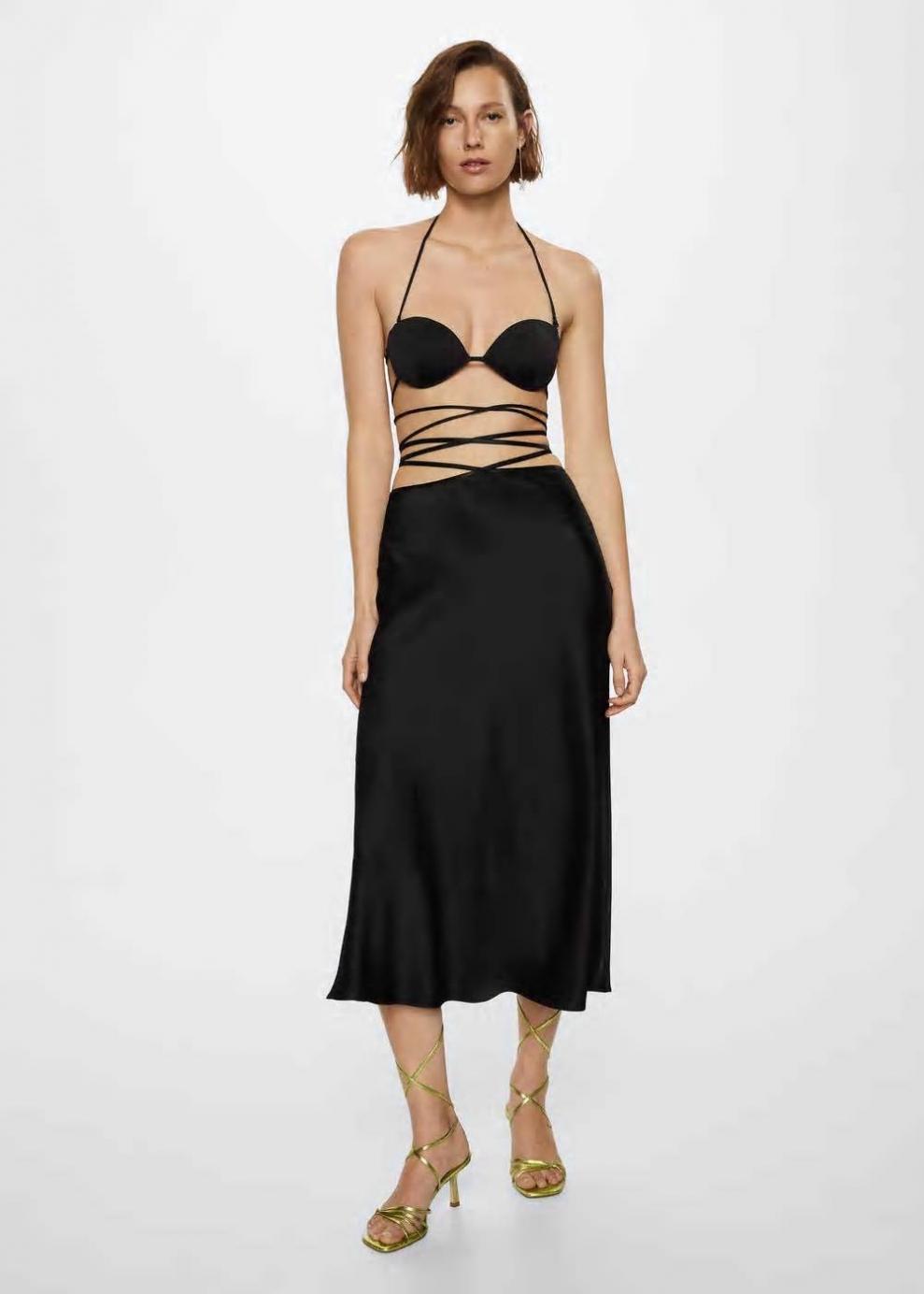 Tejido satinado Diseño midi Diseño evasé Cinta en la cintura con cierre de lazo Cierre lateral de cremallera Colección fiesta y ceremonia…