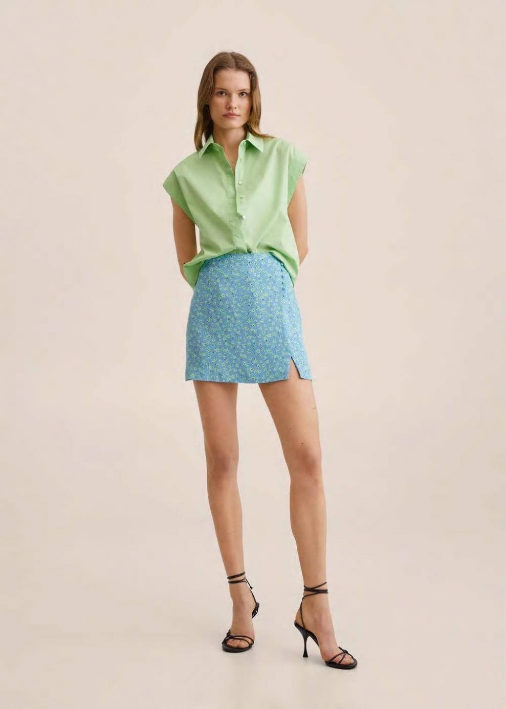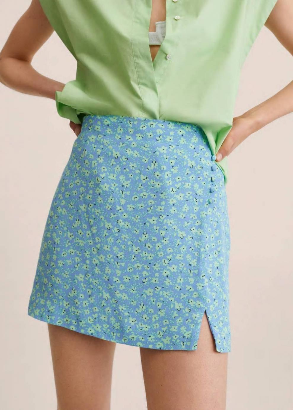 Tejido fluido Estampado floral Diseño recto Diseño mini Tiro medio Botones decorativos Abertura en el bajo parte delantera Forro interior Cierre lateral de cremallera Total look