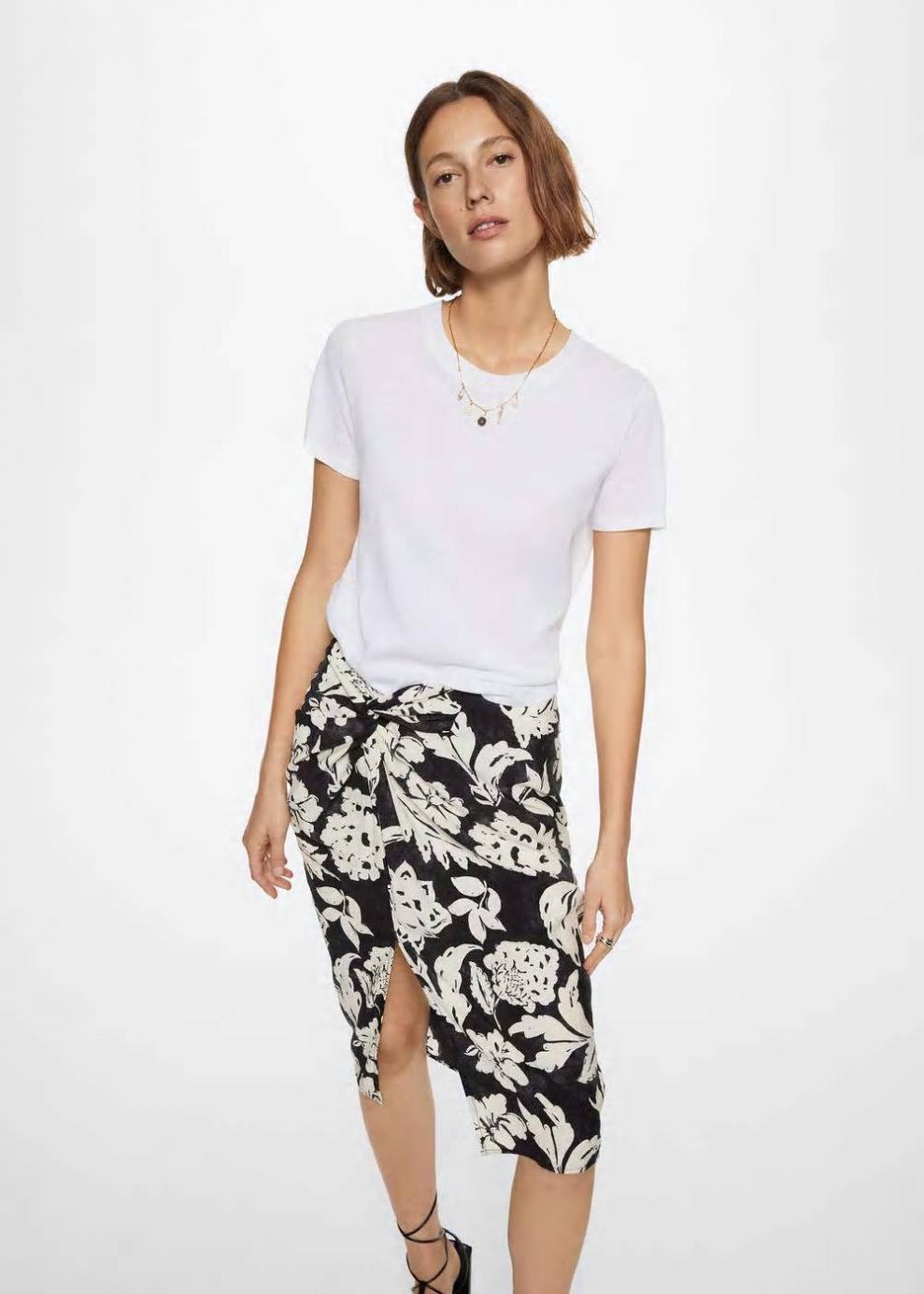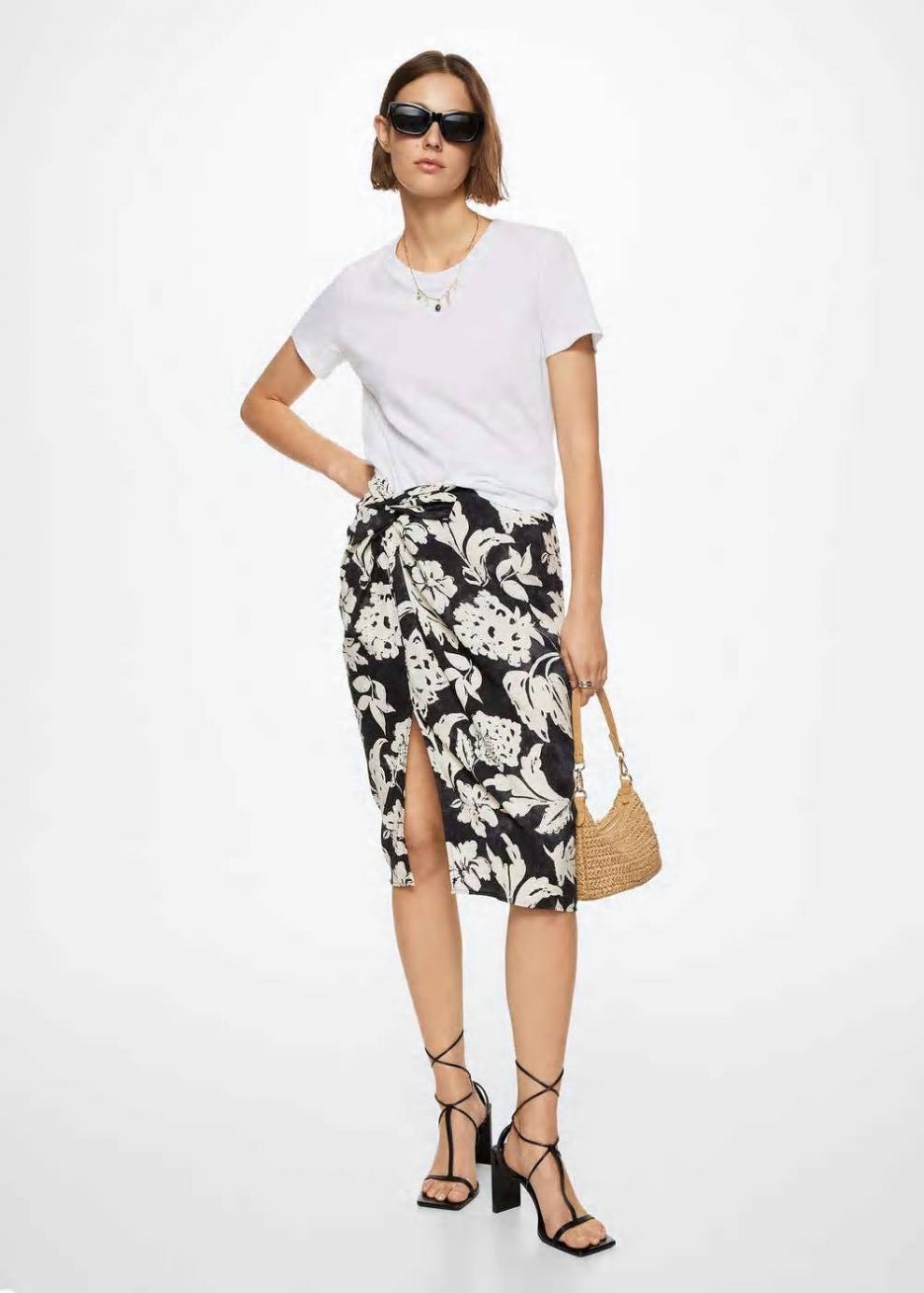 Colección Committed Tejido fluido Estampado de flores Diseño recto Diseño midi Abertura en la parte delantera Nudo decorativo Cierre lateral de cremallera Las prendas etiquetadas como Committed son productos que han sido confeccionadas con fibras y/o procesos de producción sostenible, reduciendo así su impacto ambiental. El objetivo de Mango es respaldar la implementación de prácticas más comprometidas con el medio ambiente, aumentando así, el número de prendas sostenibles en su colección.