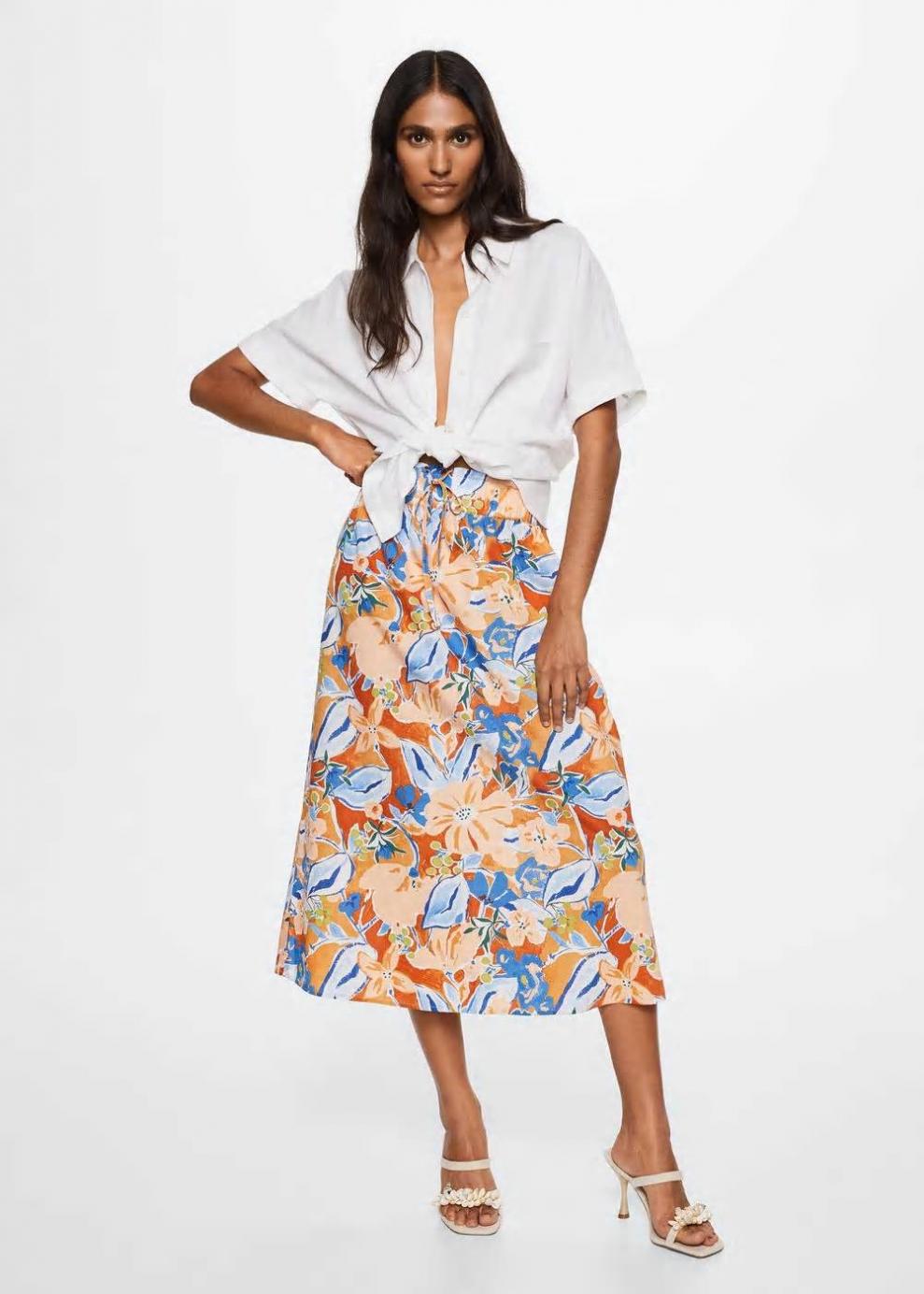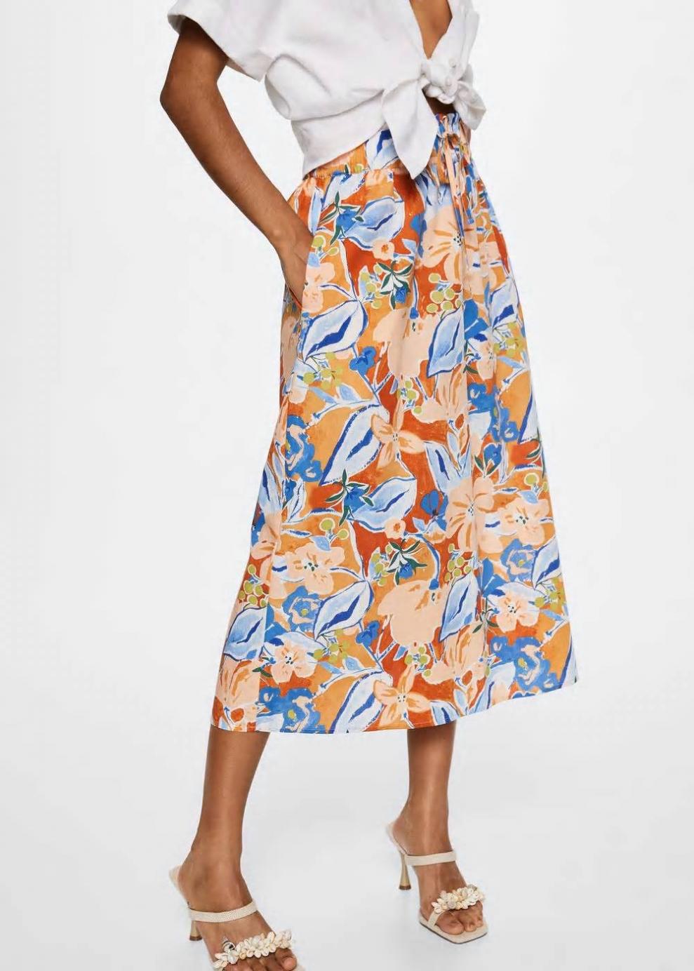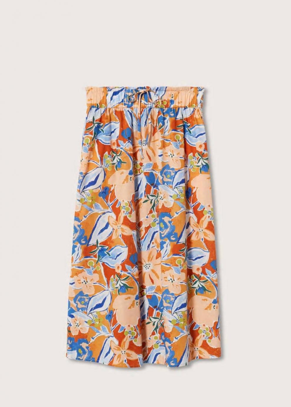 Colección Committed Tejido 100% algodón Estampado de flores Diseño midi Diseño evasé Cintura elástica con cordón Total look Las prendas etiquetadas como Committed son productos que han sido confeccionadas con fibras y/o procesos de producción sostenible, reduciendo así su impacto ambiental. El objetivo de Mango es respaldar la implementación de prácticas más comprometidas con el medio ambiente, aumentando así, el número de prendas sostenibles en su colección.