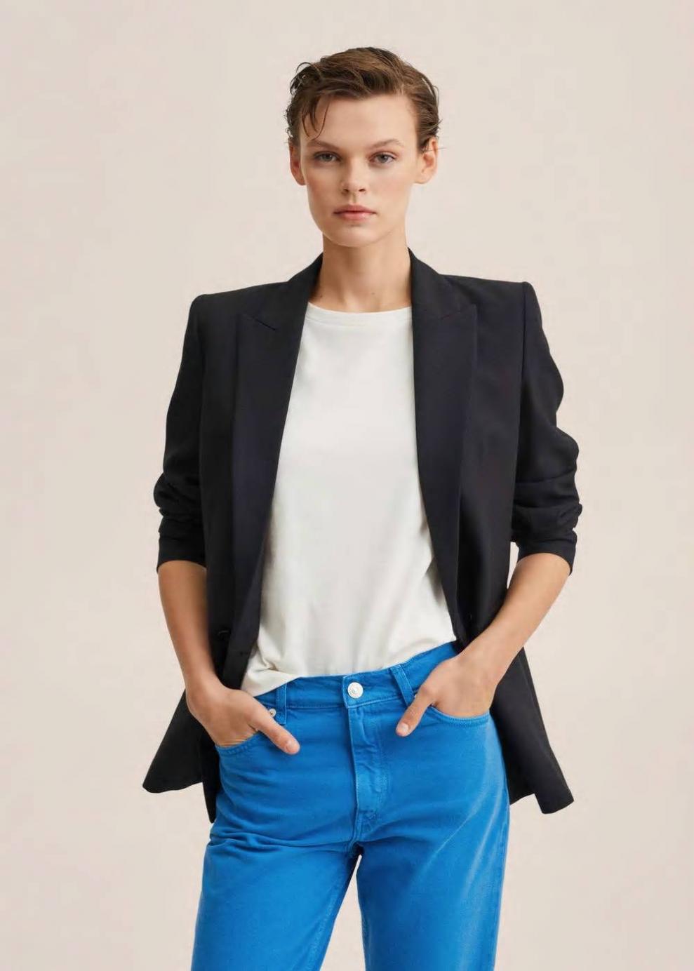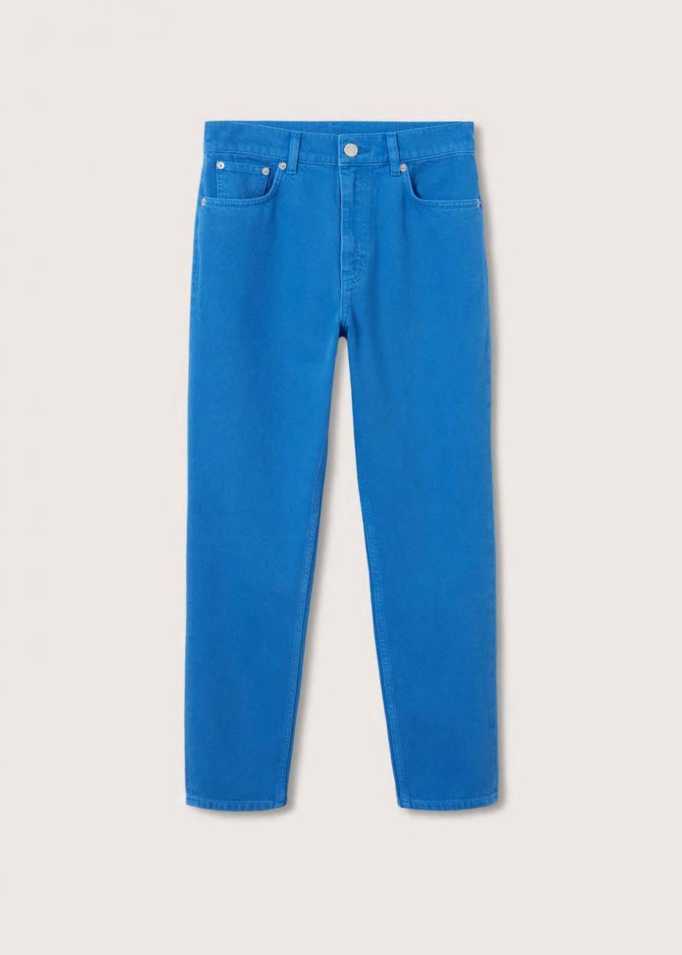 Colección Committed Tejido de algodón estilo tejano vaquero Tejido mezcla de algodón reciclado Mom-fit Tiro alto Ankle brace Trabillas Cinco bolsillos Cierre de cremallera y botón Las prendas etiquetadas como Committed son productos que han sido confeccionadas con fibras y/o procesos de producción sostenible, reduciendo así su impacto ambiental. El objetivo de Mango es respaldar la implementación de prácticas más comprometidas con el medio ambiente, aumentando así, el número de prendas sostenibles en su colección.