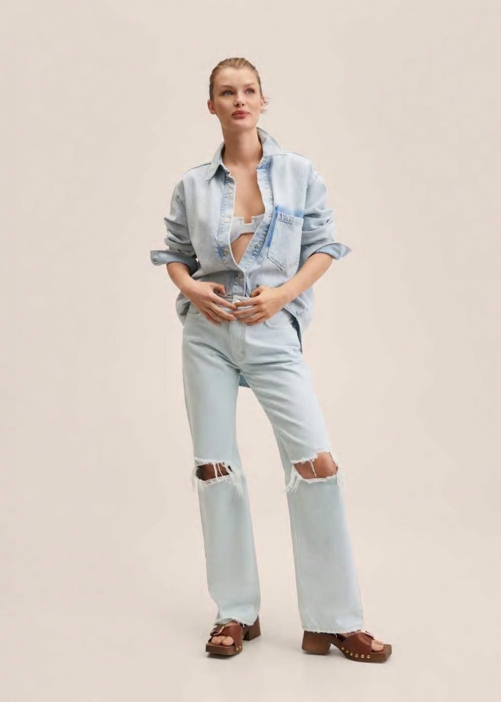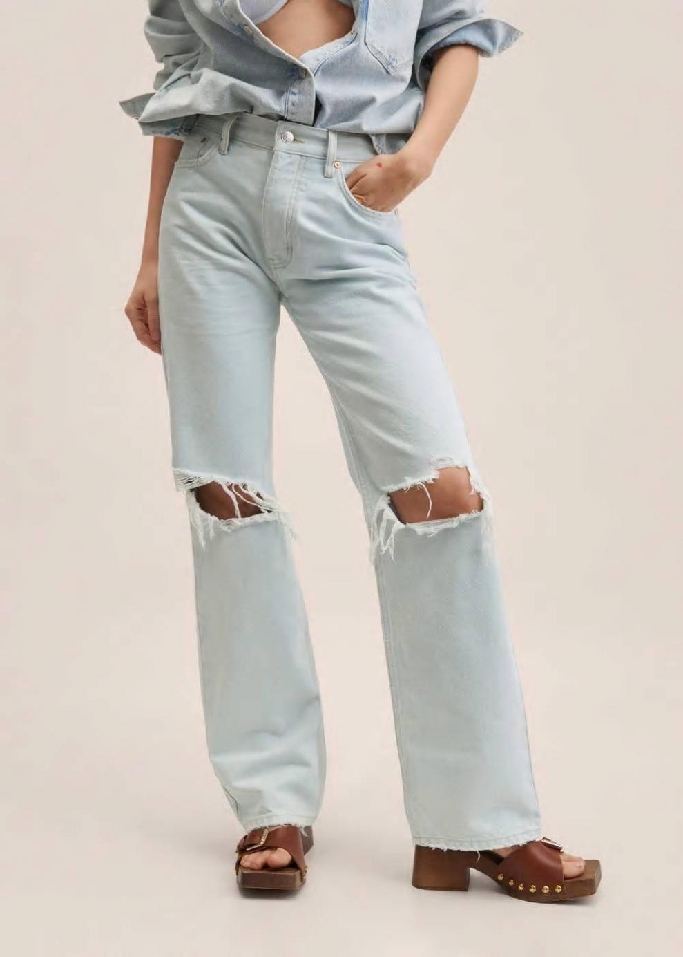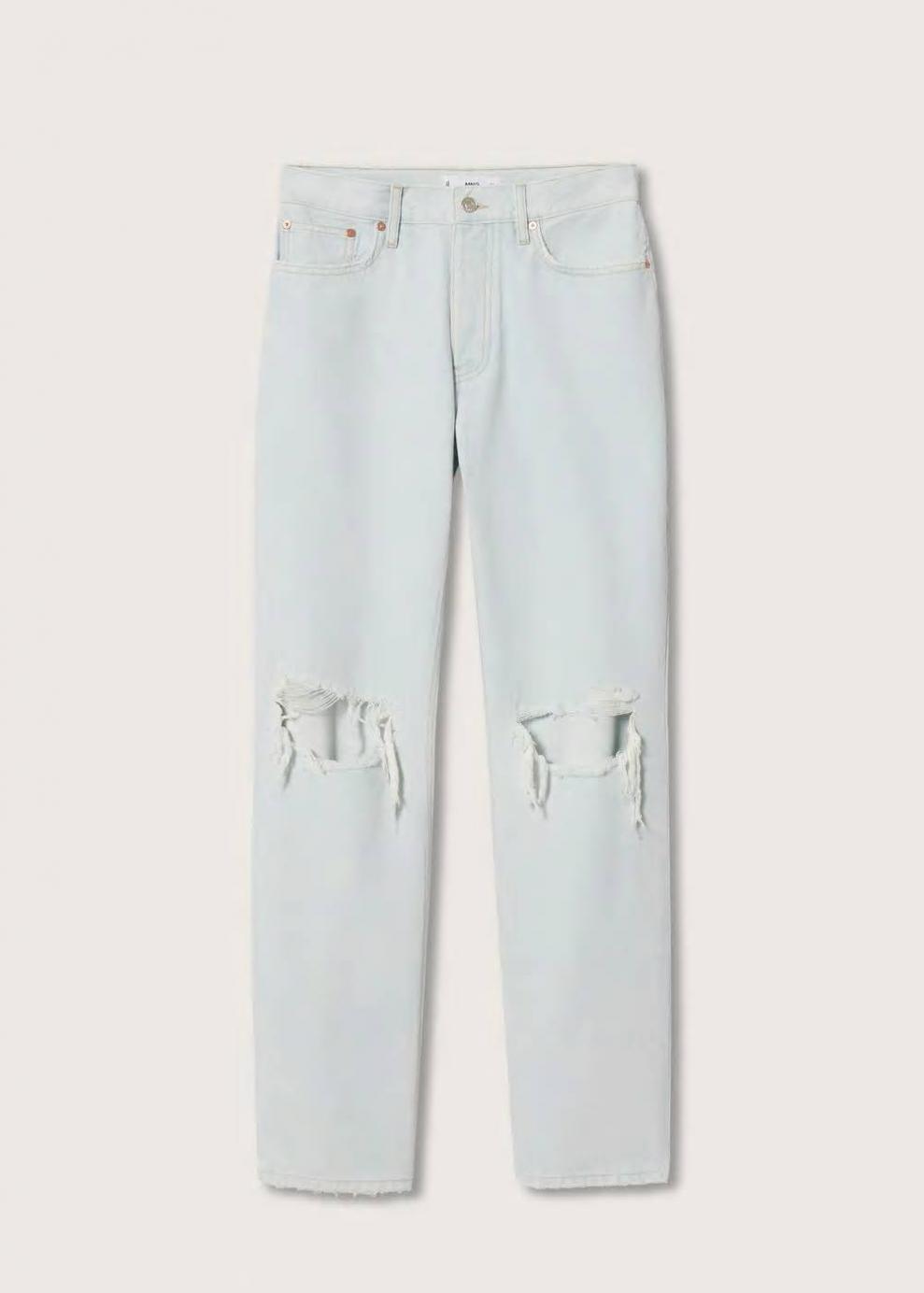 Colección Committed 100% Algodón Tejido mezcla de algodón reciclado Tejido de algodón estilo tejano vaquero Diseño largo Diseño recto Tiro alto Detalle rotos decorativos Trabillas Cinco bolsillos Cierre de cremallera y botón Disponible Plus Las prendas etiquetadas como Committed son productos que han sido confeccionadas con fibras y/o procesos de producción sostenible, reduciendo así su impacto ambiental. El objetivo de Mango es respaldar la implementación de prácticas más comprometidas con el medio ambiente, aumentando así, el número de prendas sostenibles en su colección.