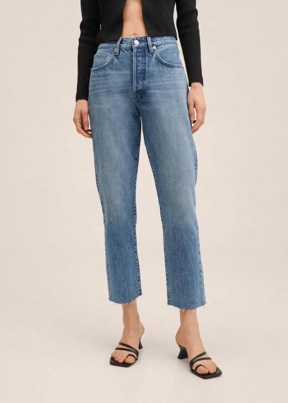 Colección Committed 100% Algodón Tejido de algodón estilo tejano vaquero Diseño recto Diseño crop Tiro alto Trabillas Cinco bolsillos Cierre de botón Bajo deshilachado Disponible Plus Tallaje más grande de lo habitual Las prendas etiquetadas como Committed son productos que han sido confeccionadas con fibras y/o procesos de producción sostenible, reduciendo así su impacto ambiental. El objetivo de Mango es respaldar la implementación de prácticas más comprometidas con el medio ambiente, aumentando así, el número de prendas sostenibles en su colección.