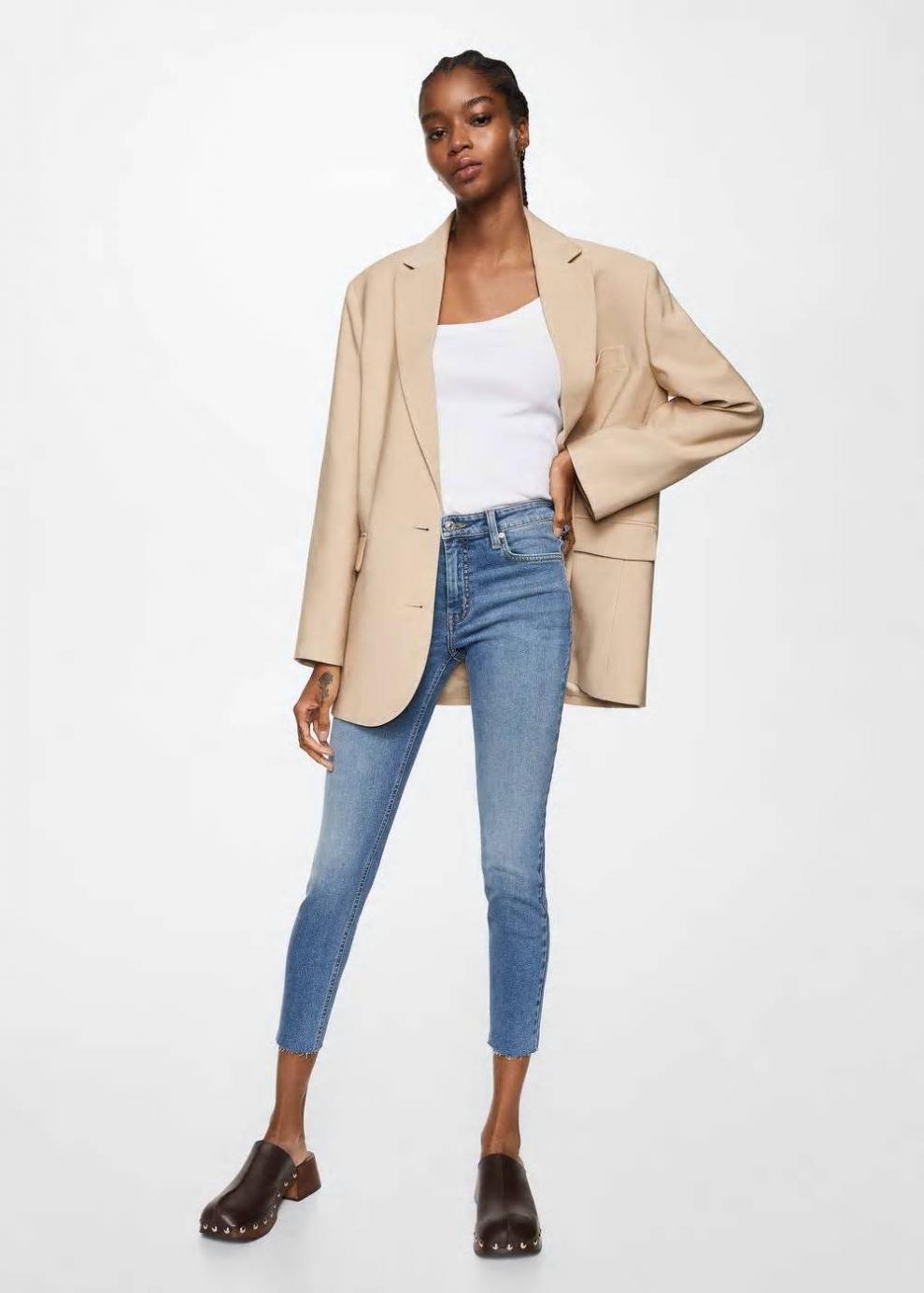 Colección Committed Tejido de algodón estilo tejano vaquero Tejido elástico Corte skinny Diseño crop Tiro medio Terminaciones deshilachadas Trabillas Cinco bolsillos Cierre de cremallera y botón Disponible Plus Largo interior 68 cm Las prendas etiquetadas como Committed son productos que han sido confeccionadas con fibras y/o procesos de producción sostenible, reduciendo así su impacto ambiental. El objetivo de Mango es respaldar la implementación de prácticas más comprometidas con el medio ambiente, aumentando así, el número de prendas sostenibles en su colección.