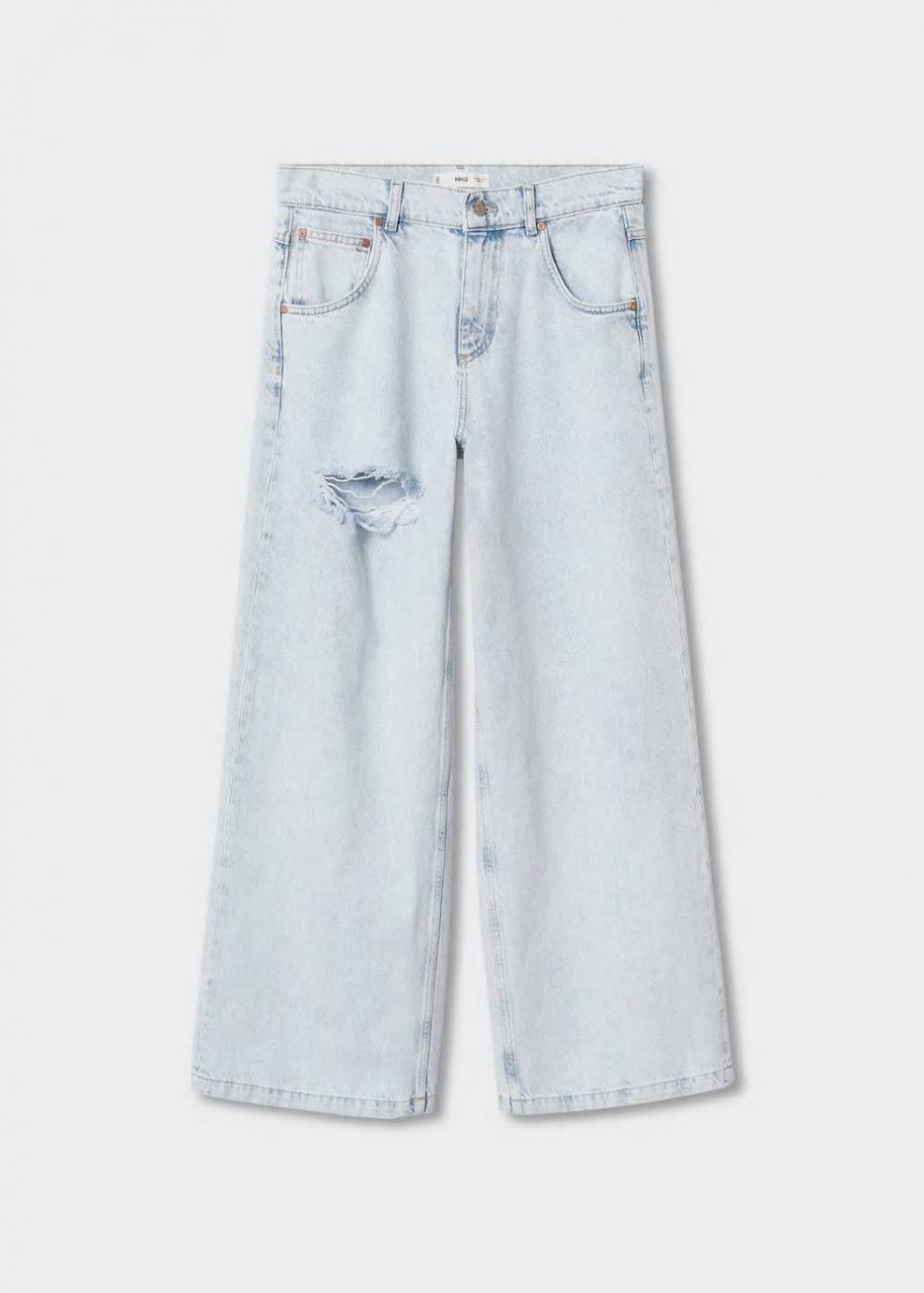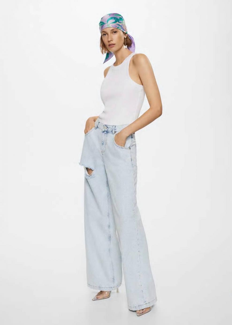 Colección Committed Tejido de algodón estilo tejano vaquero Tejido mezcla de algodón reciclado Diseño wideleg Diseño largo Tiro alto Lavado bleached Roto decorativo Cinco bolsillos Trabillas Cierre de cremallera y botón Tallaje más grande de lo habitual, se recomienda comprar una talla más pequeña Largo interior 80 cm Las prendas etiquetadas como Committed son productos que han sido confeccionadas con fibras y/o procesos de producción sostenible, reduciendo así su impacto ambiental. El objetivo de Mango es respaldar la implementación de prácticas más comprometidas con el medio ambiente, aumentando así, el número de prendas sostenibles en su colección.