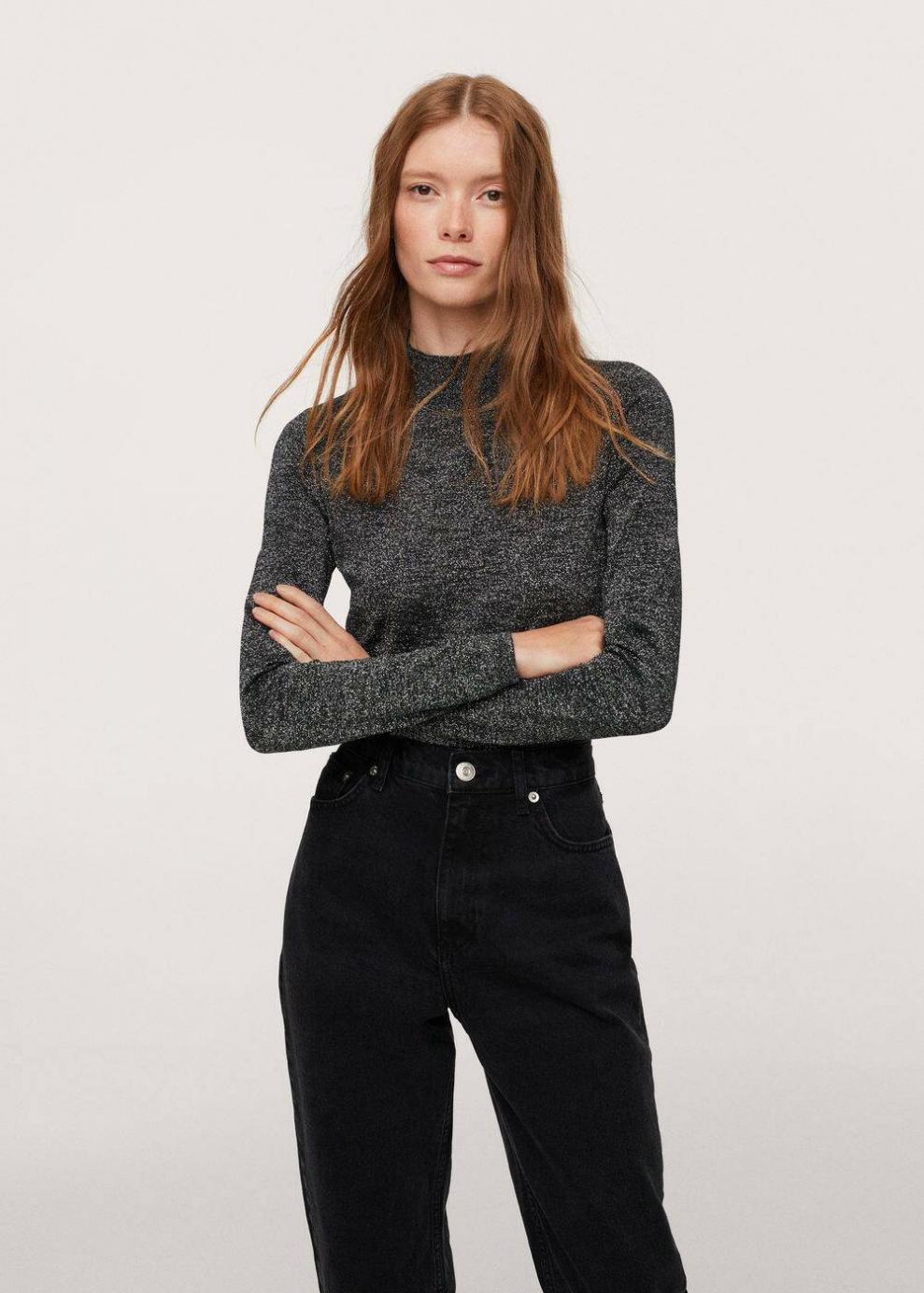 Tejido de punto fino Tejido con hilo metalizado Diseño recto Diseño entallado Cuello perkins Manga larga Terminaciones de canalé…