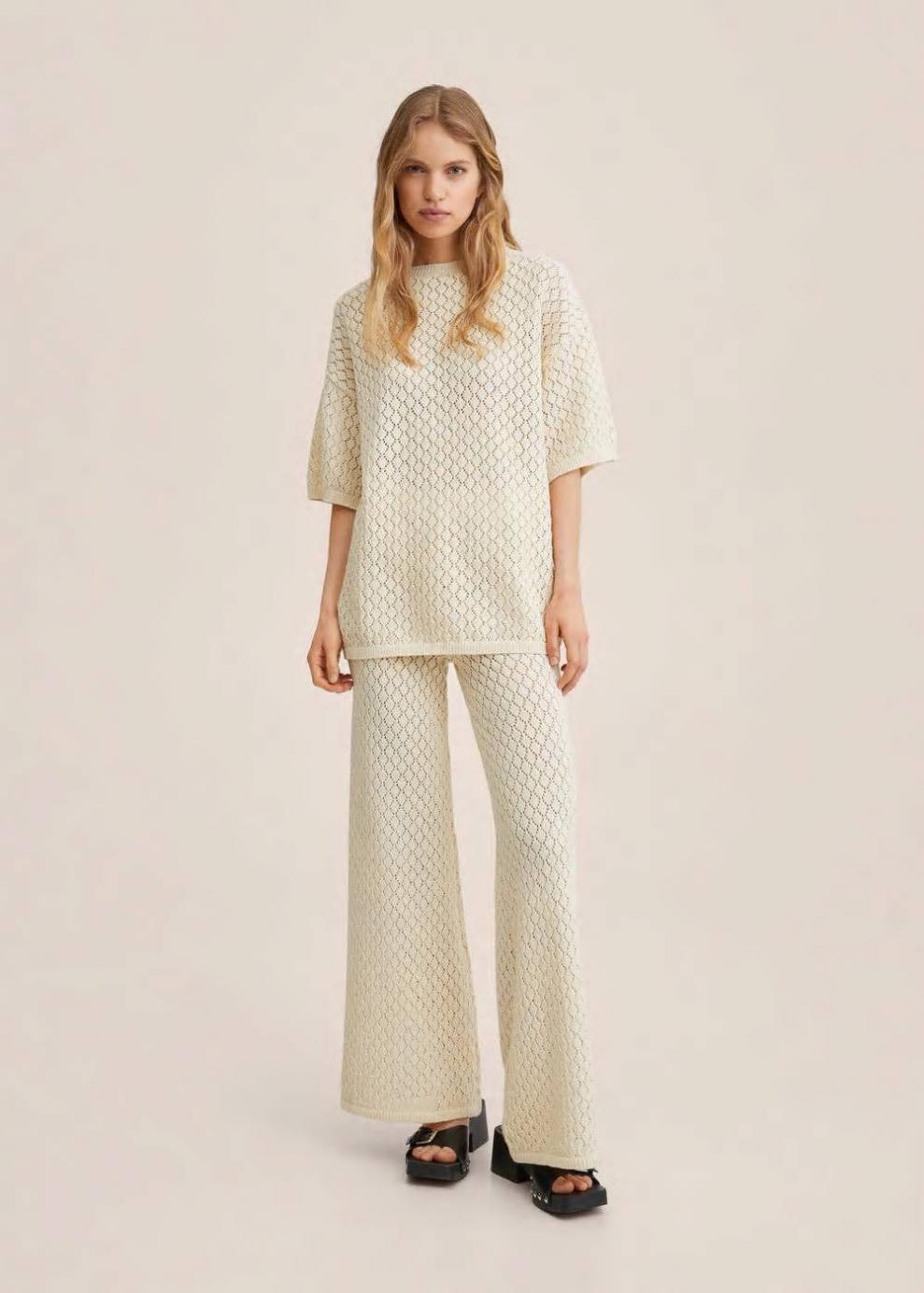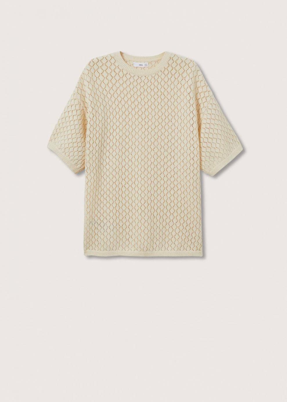 Colección Committed Tejido de punto Terminaciones en canalé Diseño calado Diseño oversize Diseño largo Cuello redondo Manga corta Total look Las prendas etiquetadas como Committed son productos que han sido confeccionadas con fibras y/o procesos de producción sostenible, reduciendo así su impacto ambiental. El objetivo de Mango es respaldar la implementación de prácticas más comprometidas con el medio ambiente, aumentando así, el número de prendas sostenibles en su colección.