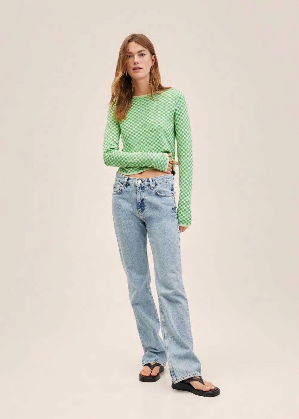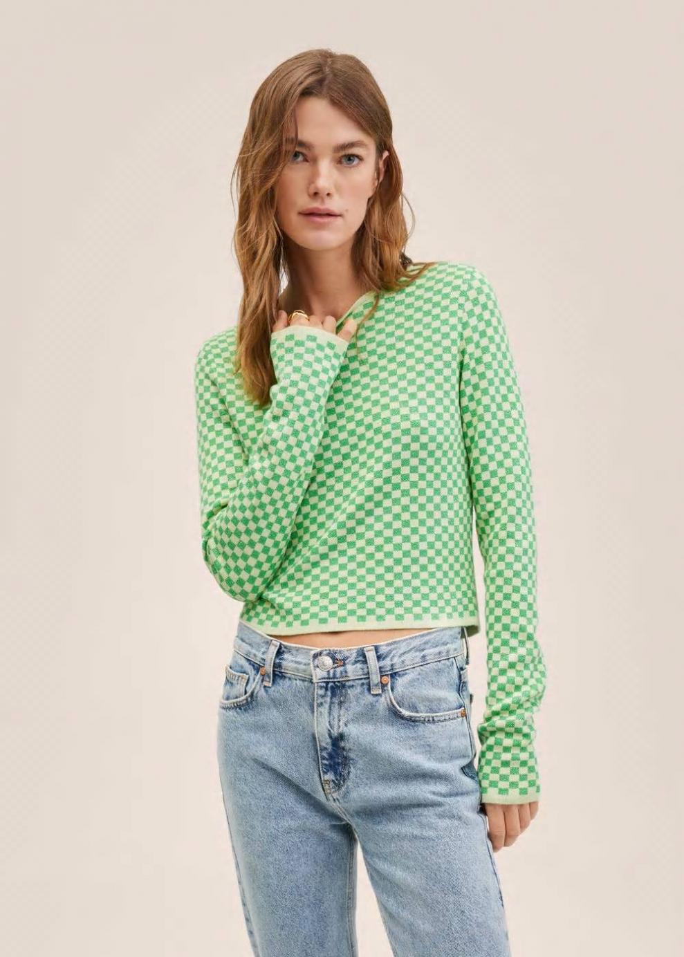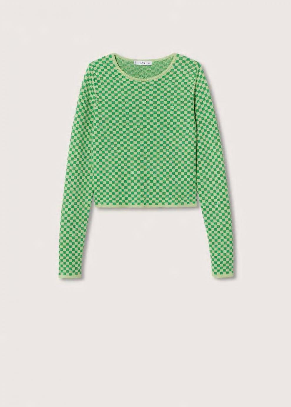 Tejido de punto fino Estampado de cuadros Diseño recto Diseño crop Cuello redondo Manga larga