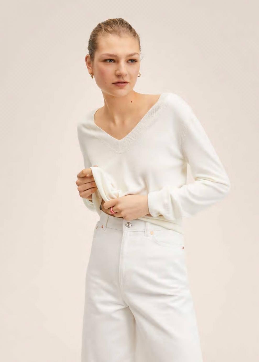 Tejido de punto fino Tejido mezcla de lana Terminaciones en canalé Diseño recto Cuello pico Manga larga