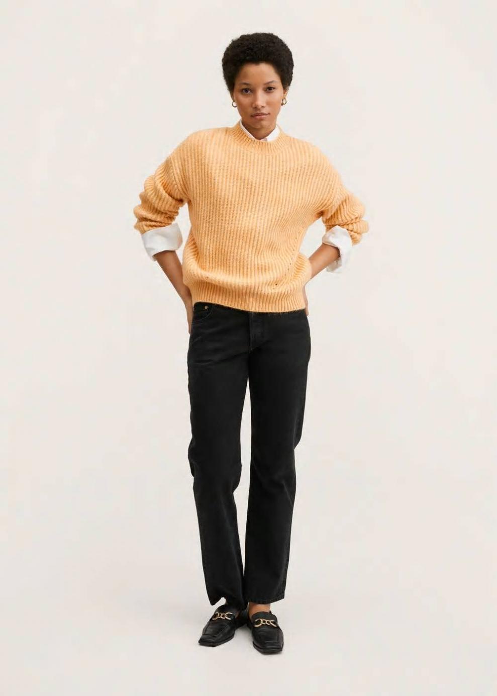 Diseño estándar Colección Committed Tejido de punto grueso Diseño recto Costura del hombro caída Cuello redondo Manga larga Disponible Plus Las prendas etiquetadas como Committed son productos que han sido confeccionadas con fibras y/o procesos de producción sostenible, reduciendo así su impacto ambiental. El objetivo de Mango es respaldar la implementación de prácticas más comprometidas con el medio ambiente, aumentando así, el número de prendas sostenibles en su colección.