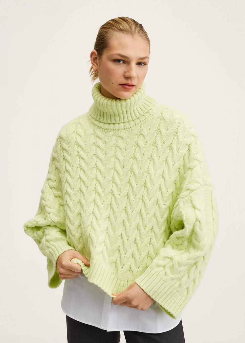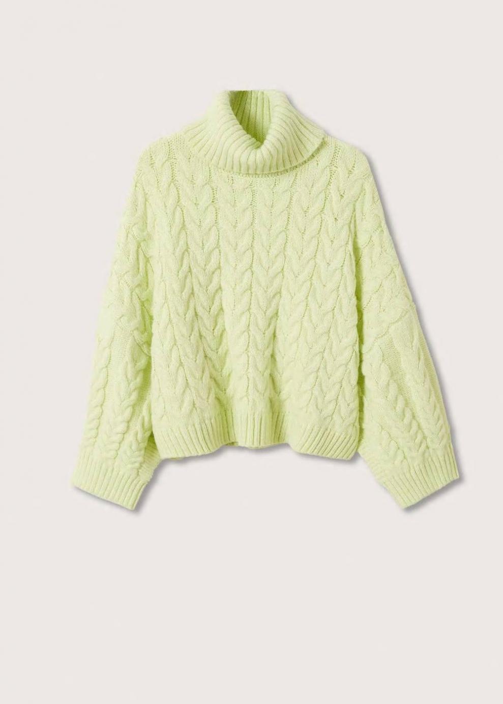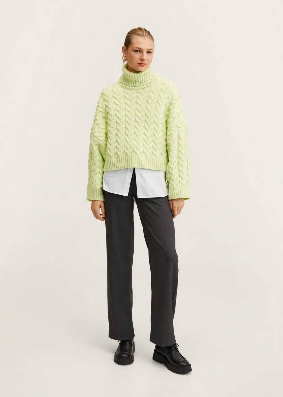 Tejido de punto grueso Diseño trenzado Terminaciones en canalé Diseño oversize Diseño crop Cuello vuelto Manga larga Tallaje más grande de lo habitual Las prendas etiquetadas como Committed son productos que han sido confeccionadas con fibras y/o procesos de producción sostenible, reduciendo así su impacto ambiental. El objetivo de Mango es respaldar la implementación de prácticas más comprometidas con el medio ambiente, aumentando así, el número de prendas sostenibles en su colección.
