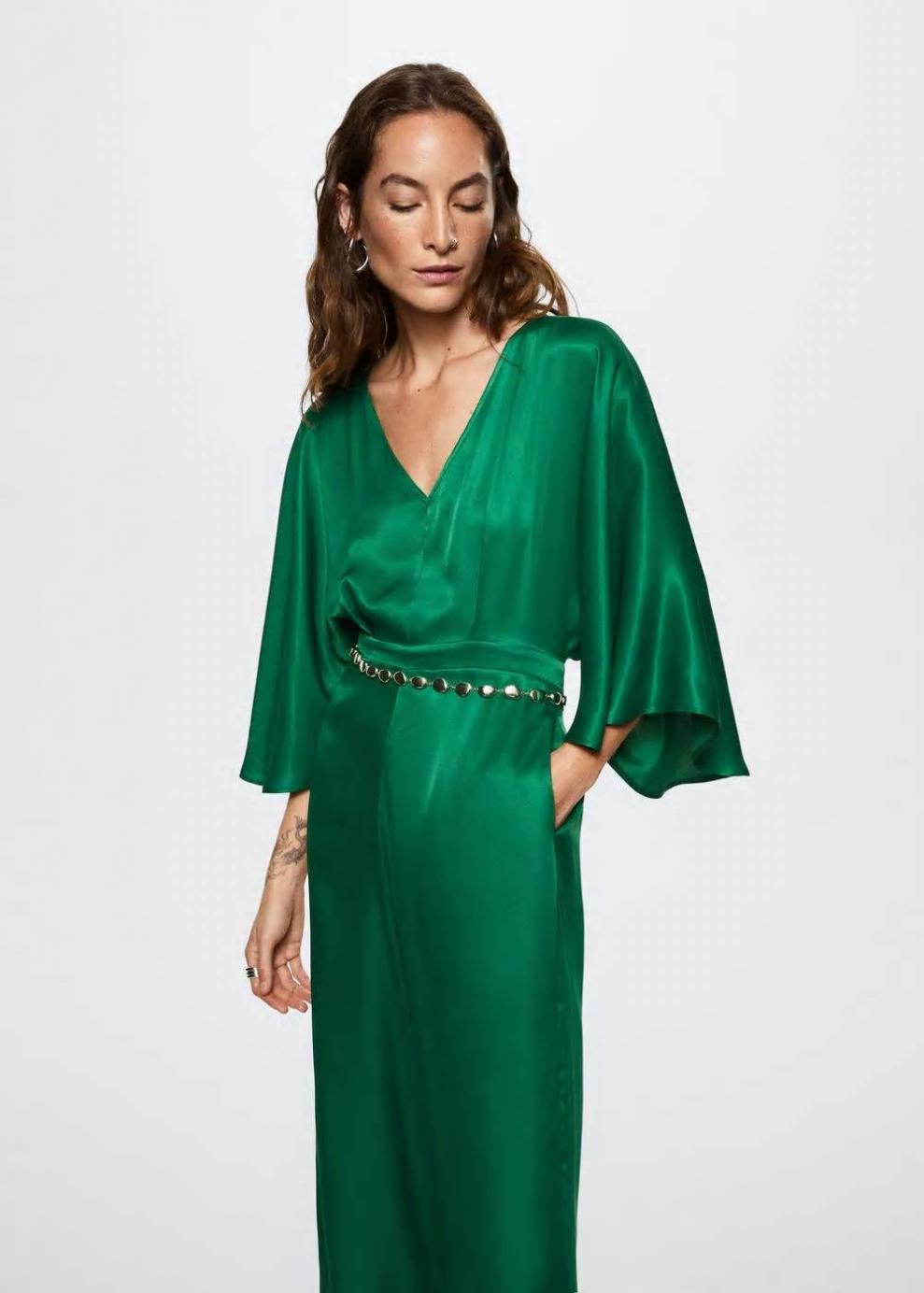 Tejido fluido Tejido satinado Diseño largo Diseño recto Cuello pico Manga tres cuartos Manga acampanada Cierre de cremallera en la parte posterior Colección fiesta y ceremonia