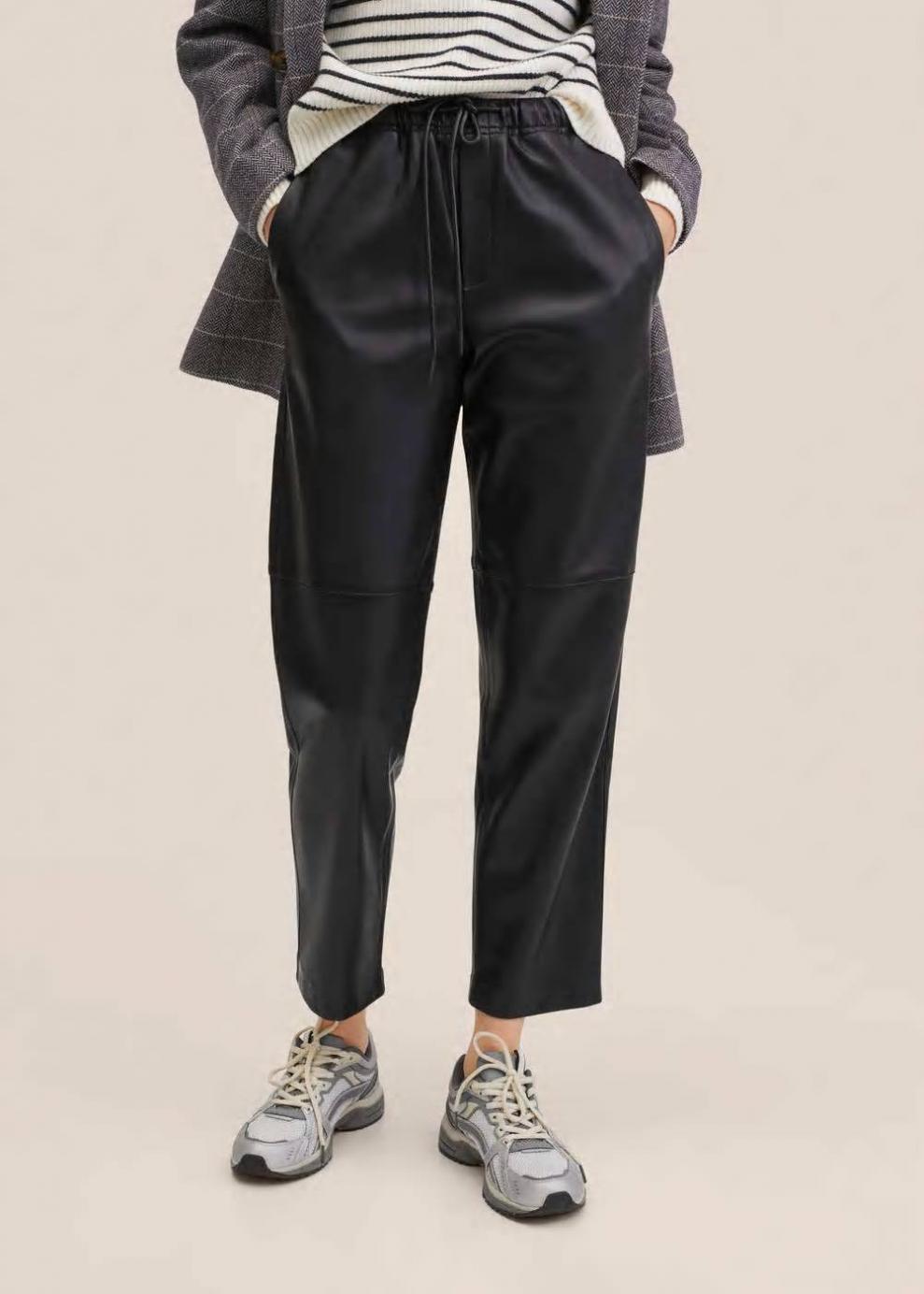 Mujer Pantalón cintura elástica efecto piel Negro | Pantalones Mango