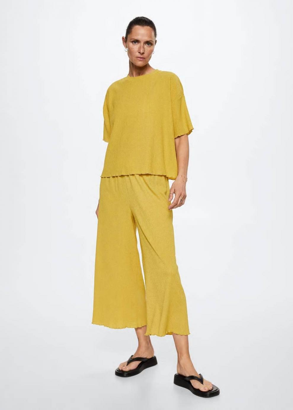Colección Committed Tejido fluido Tejido con textura Diseño culotte Total look Las prendas etiquetadas como Committed son productos que han sido confeccionadas con fibras y/o procesos de producción sostenible, reduciendo así su impacto ambiental. El objetivo de Mango es respaldar la implementación de prácticas más comprometidas con el medio ambiente, aumentando así, el número de prendas sostenibles en su colección.