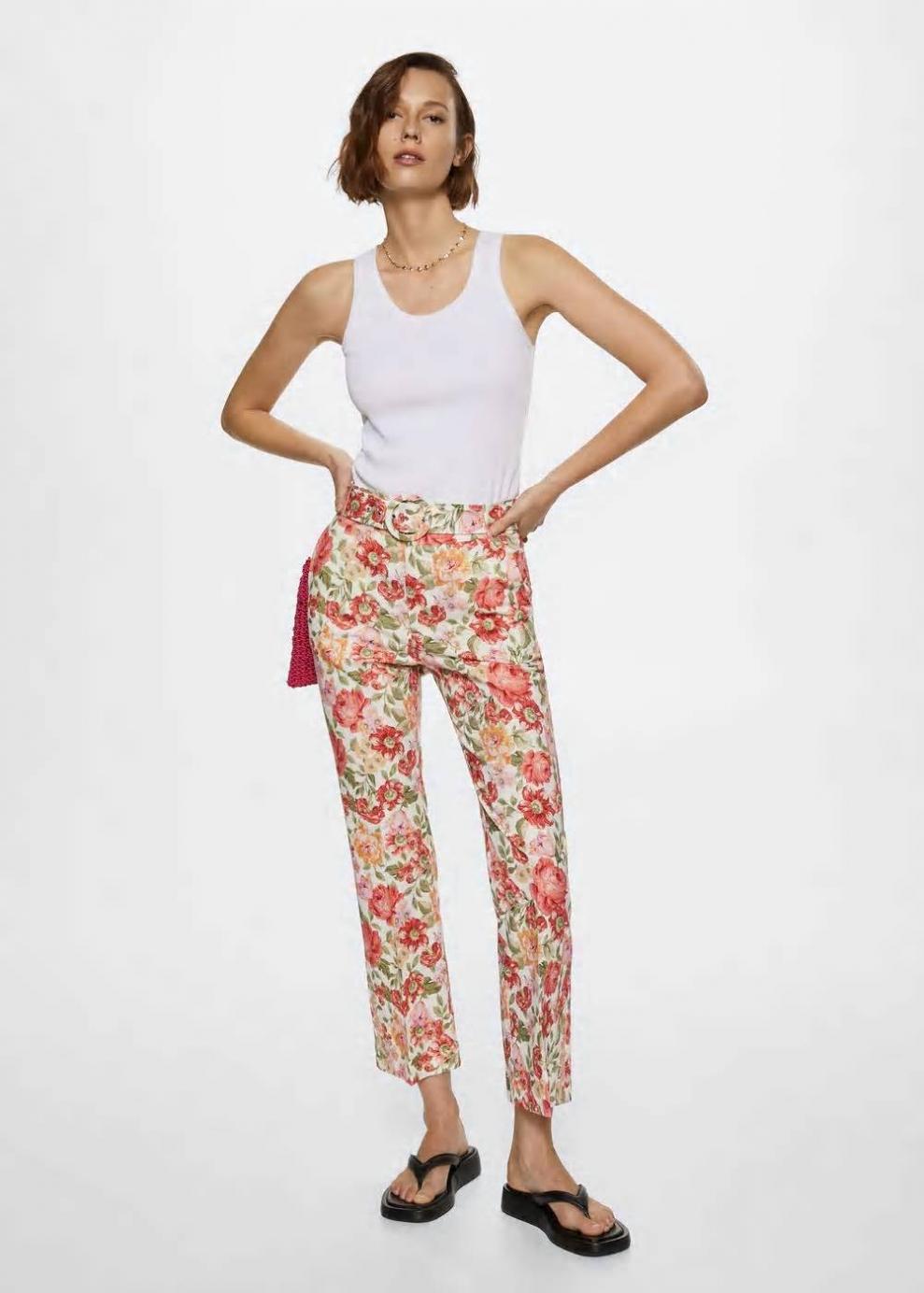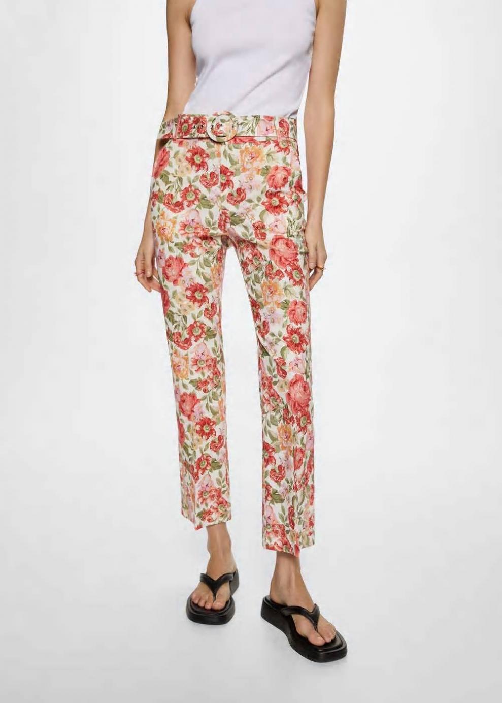 Colección Committed Tejido mezcla de lino y algodón Estampado de flores Diseño recto Diseño crop Tiro medio Dos bolsillos laterales Trabillas Cinturón con cierre de hebilla Cierre oculto de botón, gancho y cremallera Las prendas etiquetadas como Committed son productos que han sido confeccionadas con fibras y/o procesos de producción sostenible, reduciendo así su impacto ambiental. El objetivo de Mango es respaldar la implementación de prácticas más comprometidas con el medio ambiente, aumentando así, el número de prendas sostenibles en su colección.