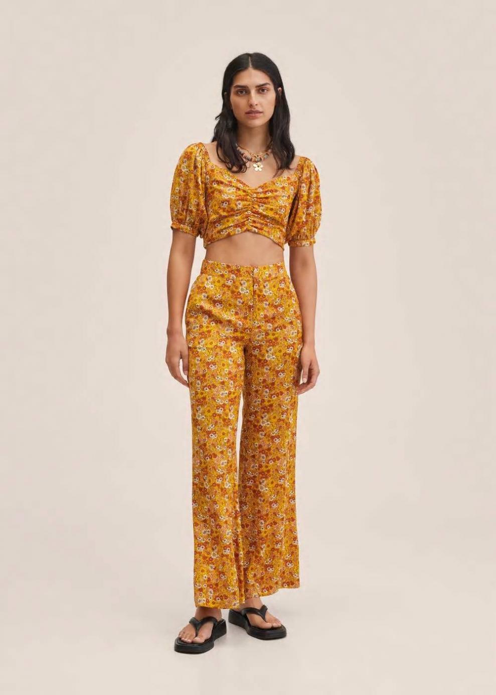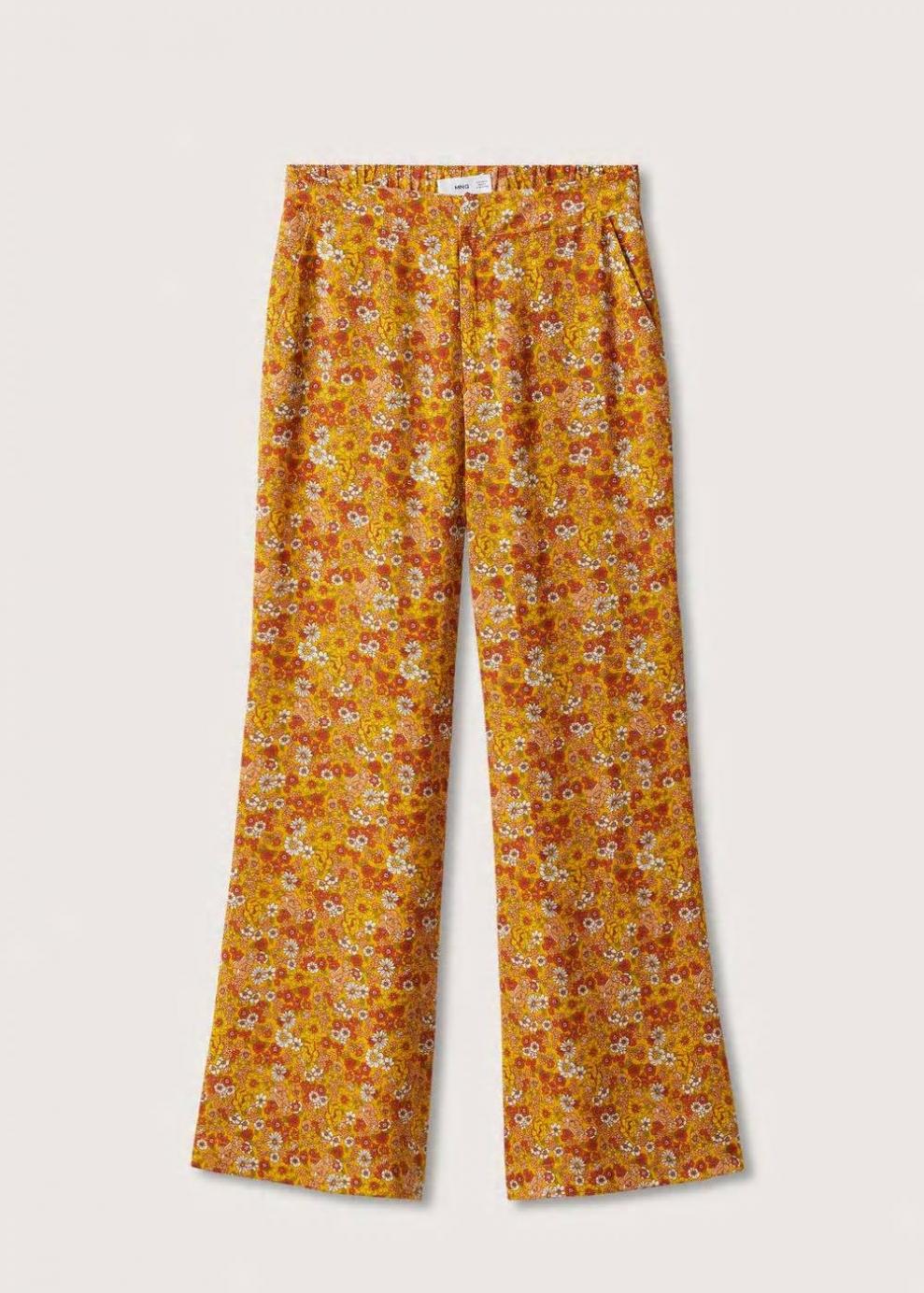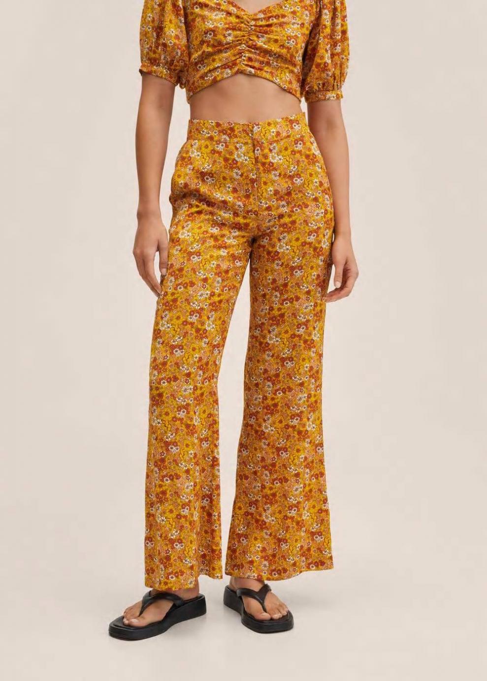 Estampado de flores Diseño wideleg Diseño largo Tiro medio Bolsillos laterales Fruncido elástico en la cintura Cierre oculto de botón, gancho …
