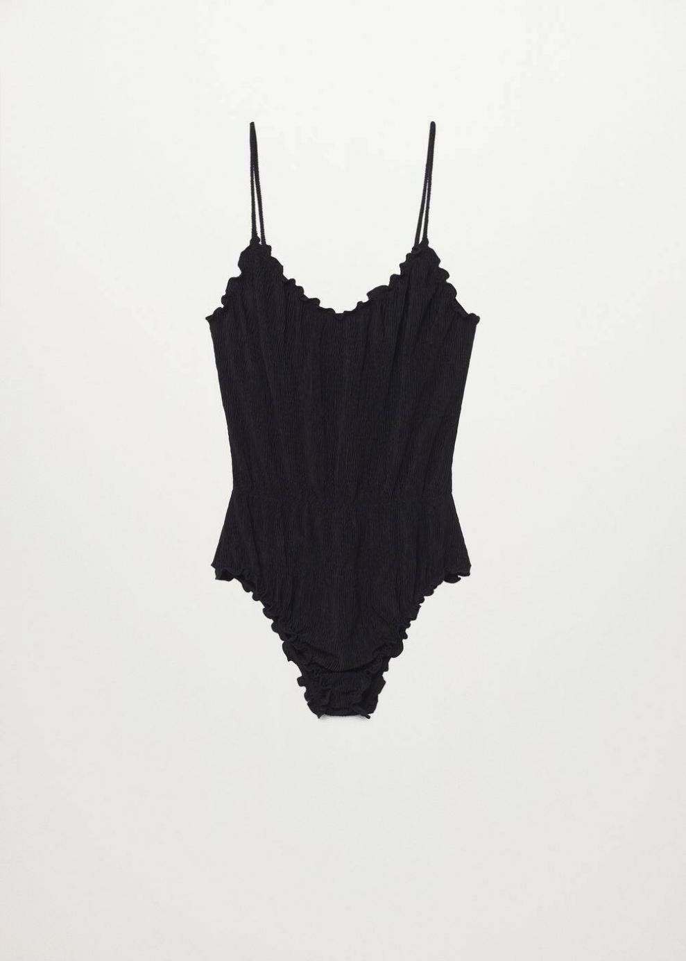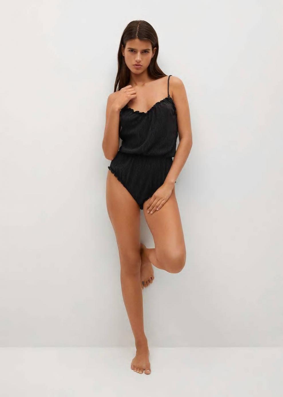 Tejido con textura Tejido elástico Diseño corto Escote de pico Tirantes finos Cintura elástica Terminaciones pespunteadas Sin cierre