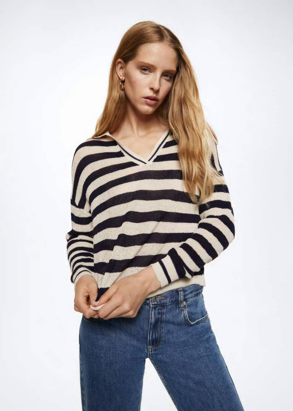 Tejido de punto fino Estampado de rayas Diseño oversize Diseño corto Cuello polo Manga larga