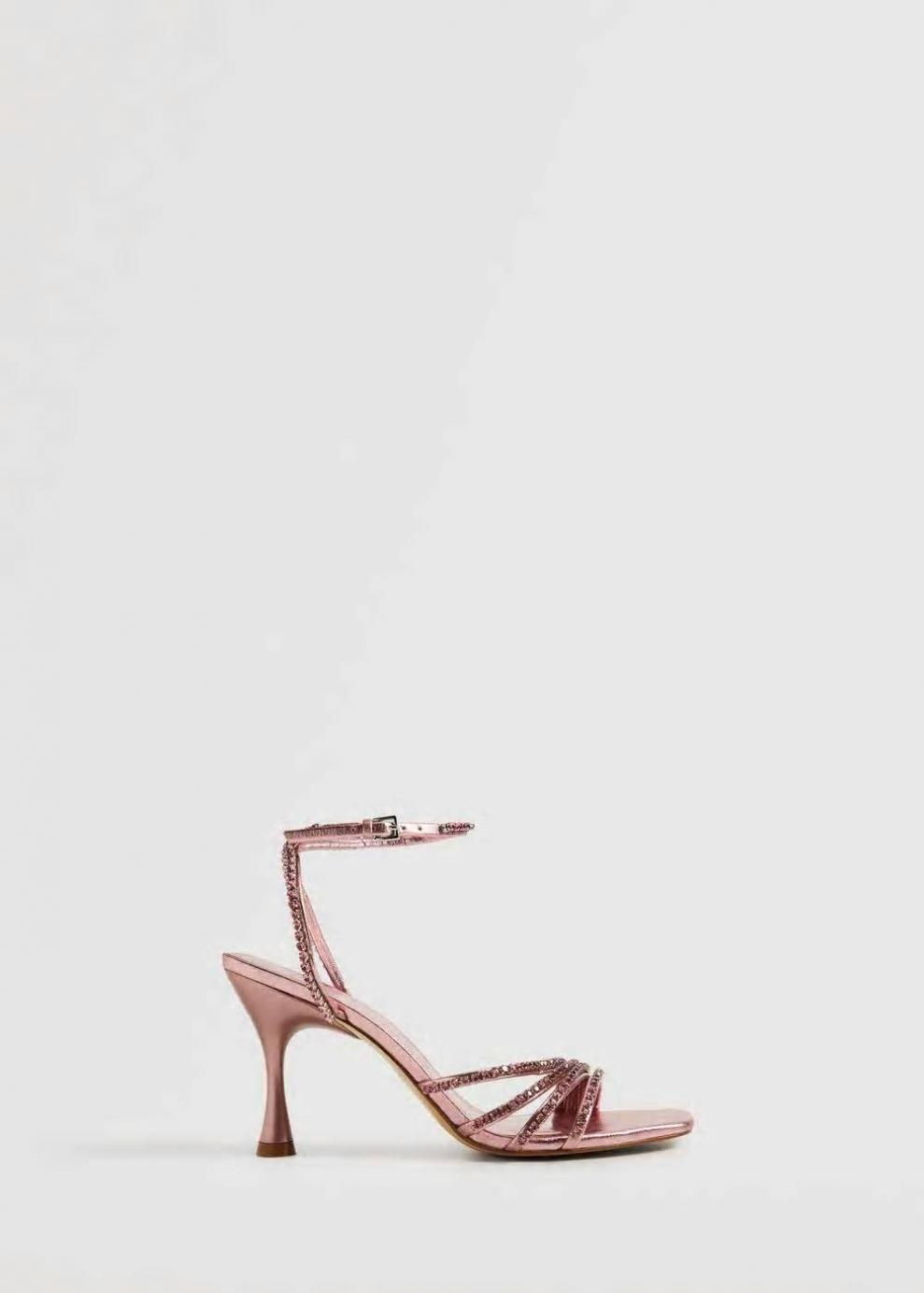 Diseño de tiras Abertura en la parte delantera Punta cuadrada Pulsera en el tobillo Apliques decorativos brillantes Tacón de aguja Cierre de hebilla El tacón mide 10 cm Colección fiesta y ceremonia