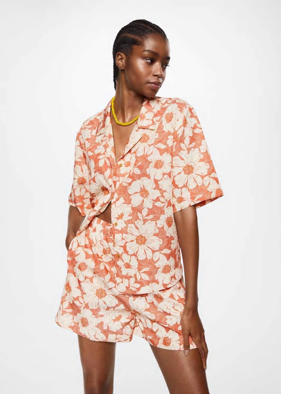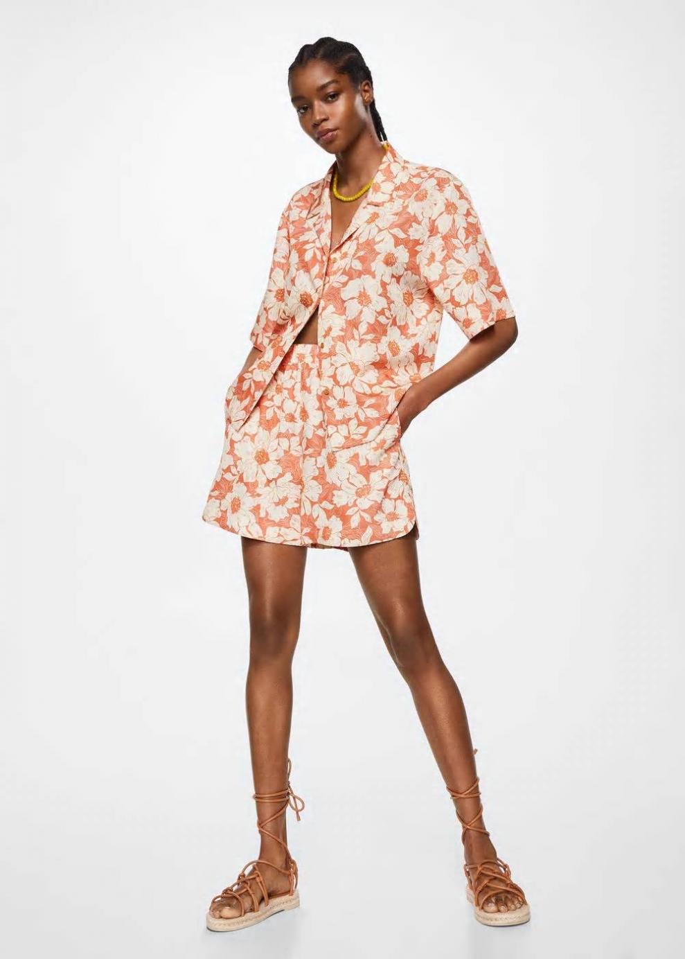 Colección Committed Tejido fluido Diseño corto Estampado de flores Cintura elástica Dos bolsillos laterales Sin cierre Total look Las prendas etiquetadas como Committed son productos que han sido confeccionadas con fibras y/o procesos de producción sostenible, reduciendo así su impacto ambiental. El objetivo de Mango es respaldar la implementación de prácticas más comprometidas con el medio ambiente, aumentando así, el número de prendas sostenibles en su colección.