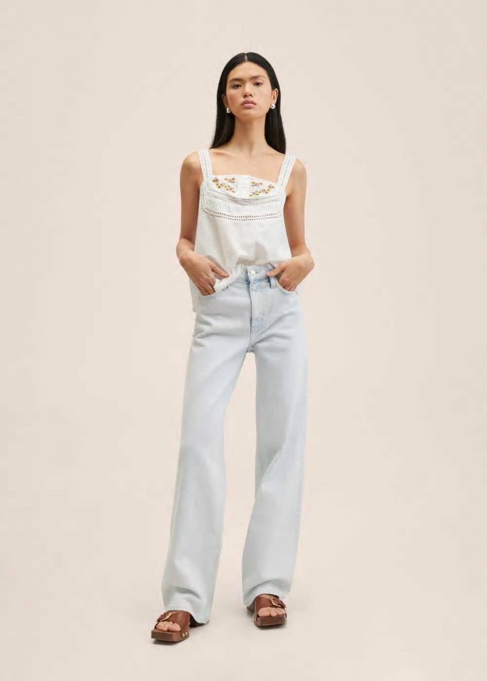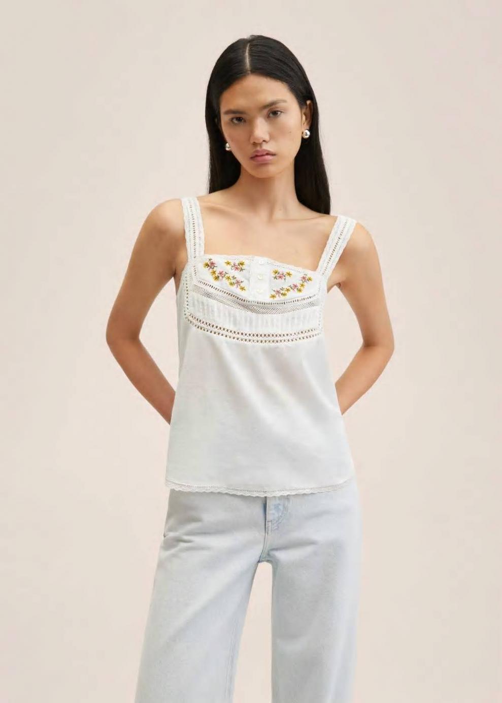 100% Algodón Bordado floral Diseño recto Cuello escotado Sin mangas Tirantes anchos Detalles calados Bordado suizo…