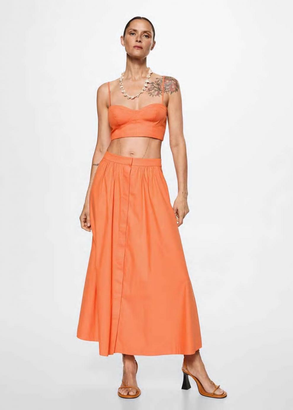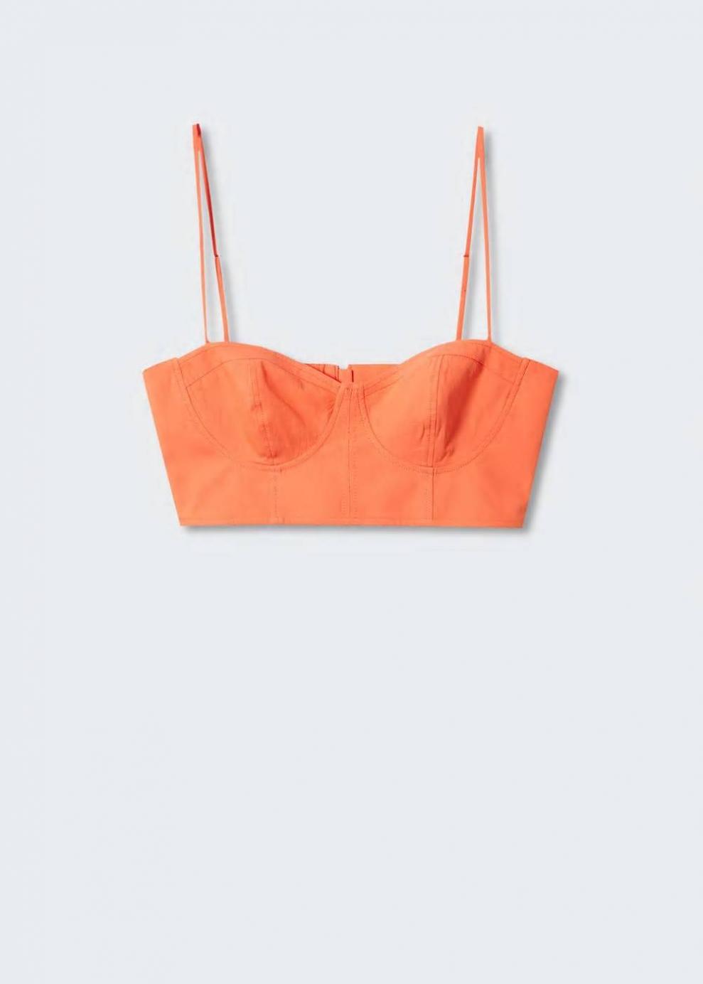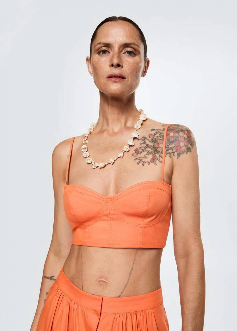 Colección Committed Tejido mezcla de algodón Diseño entallado Diseño crop Diseño efecto bra Cuello escotado Escote corazón Tirantes finos ajustables Cierre de cremallera en la parte posterior Total look Colección fiesta y ceremonia Las prendas etiquetadas como Committed son productos que han sido confeccionadas con fibras y/o procesos de producción sostenible, reduciendo así su impacto ambiental. El objetivo de Mango es respaldar la implementación de prácticas más comprometidas con el medio ambiente, aumentando así, el número de prendas sostenibles en su colección.