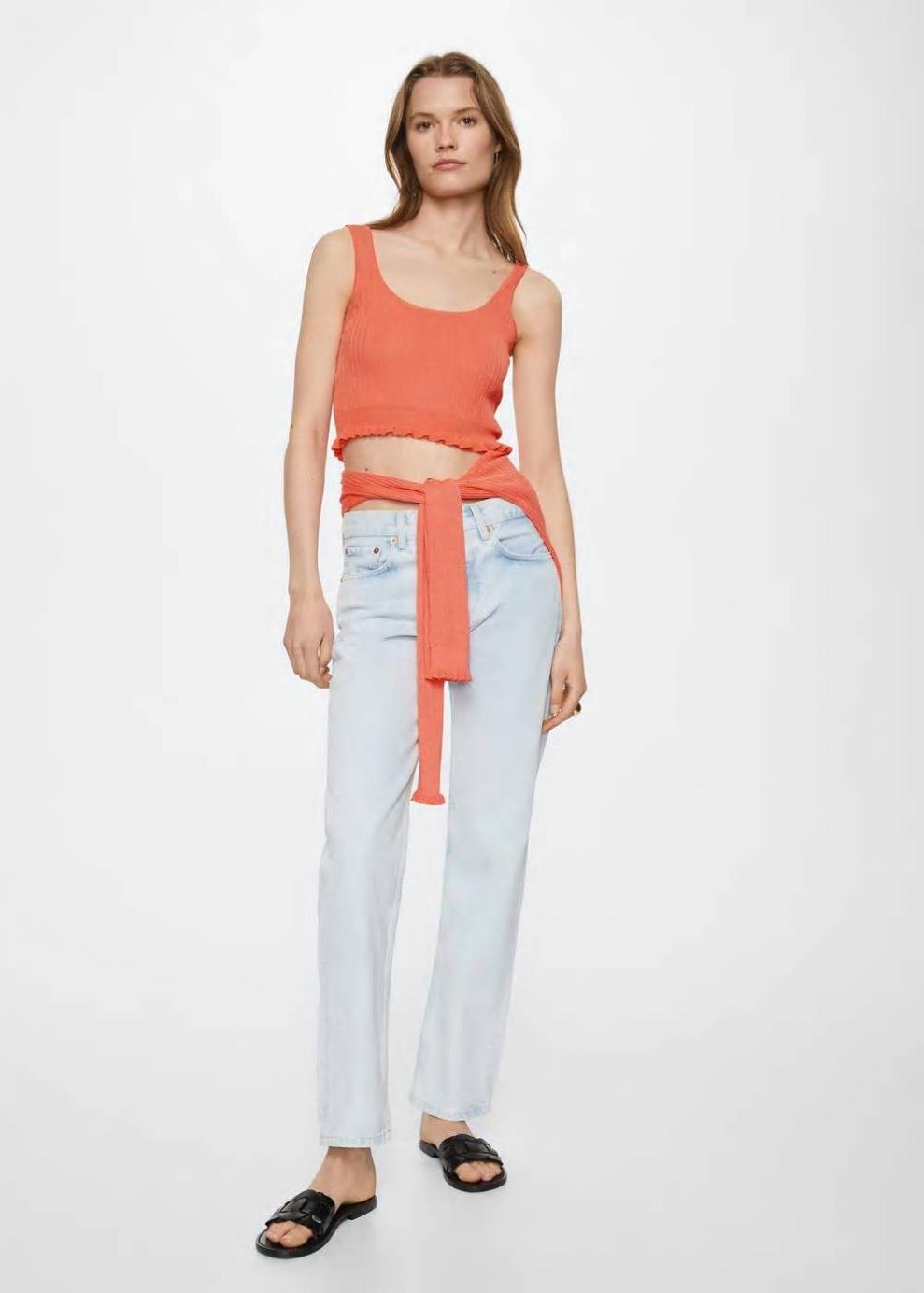 Colección Committed Tejido de punto fino Tejido de canalé Diseño entallado Diseño crop Cuello escotado Tirantes anchos Terminaciones festoneadas Las prendas etiquetadas como Committed son productos que han sido confeccionadas con fibras y/o procesos de producción sostenible, reduciendo así su impacto ambiental. El objetivo de Mango es respaldar la implementación de prácticas más comprometidas con el medio ambiente, aumentando así, el número de prendas sostenibles en su colección.