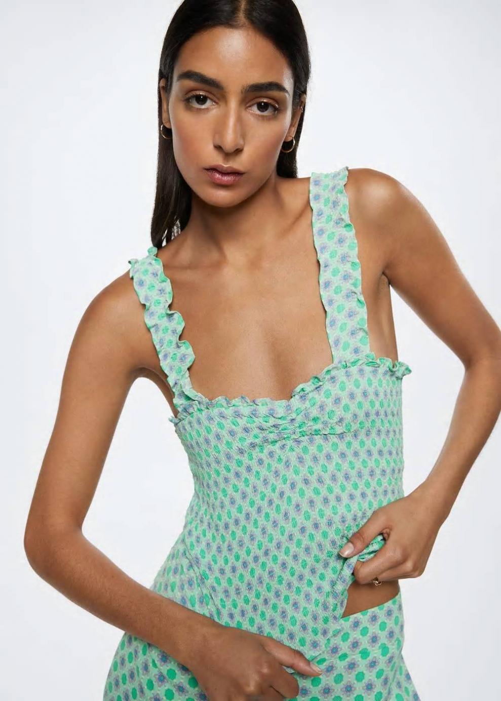 Tejido fluido Tejido con textura Diseño estampado Diseño crop Diseño entallado Cuello escotado Sin mangas Tirantes con volante Detalle fruncido en el escote Elástico en la parte posterior Total look Disponible en liso o estampado Disponible Plus Las prendas etiquetadas como Committed son productos que han sido confeccionadas con fibras y/o procesos de producción sostenible, reduciendo así su impacto ambiental. El objetivo de Mango es respaldar la implementación de prácticas más comprometidas con el medio ambiente, aumentando así, el número de prendas sostenibles en su colección.