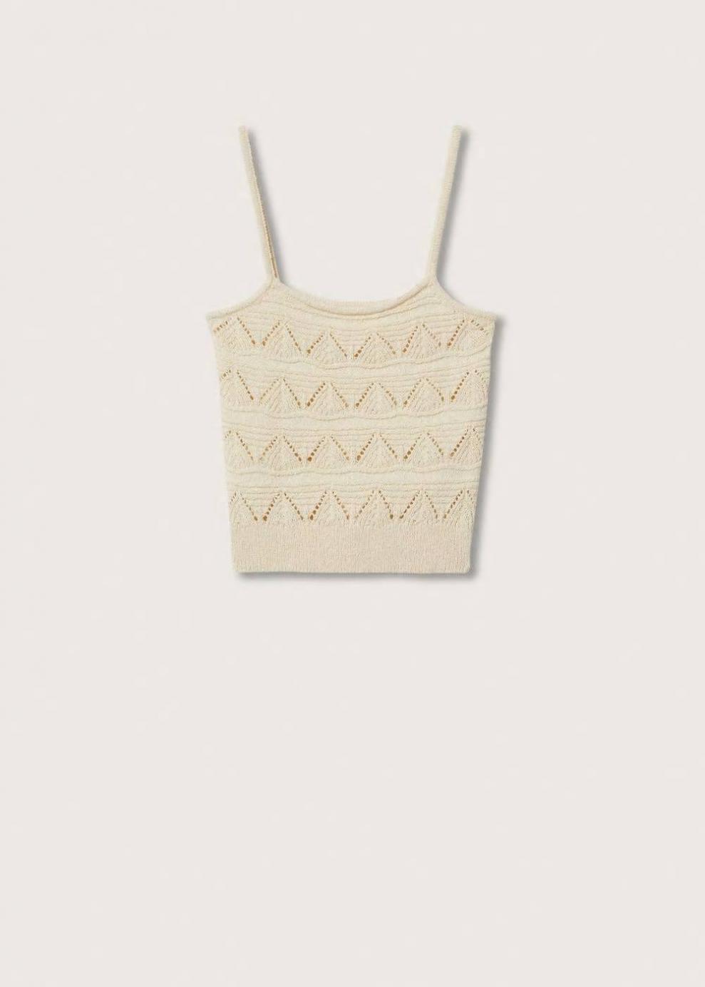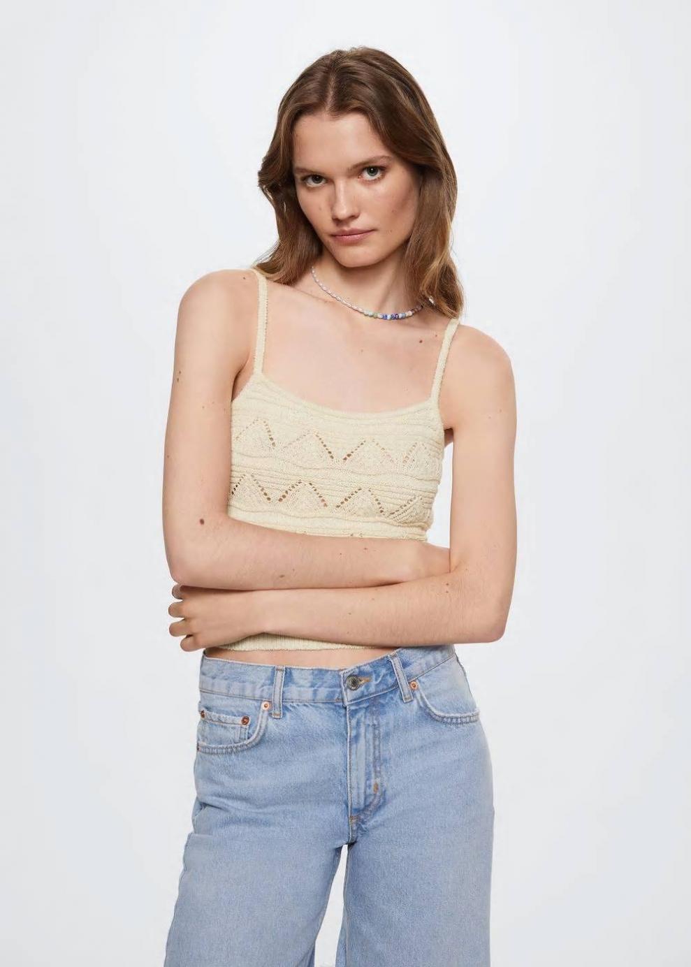 Colección Committed Tejido de punto calado Tejido semitransparente Diseño recto Diseño crop Cuello escotado Tirantes finos Sin forro interior Las prendas etiquetadas como Committed son productos que han sido confeccionadas con fibras y/o procesos de producción sostenible, reduciendo así su impacto ambiental. El objetivo de Mango es respaldar la implementación de prácticas más comprometidas con el medio ambiente, aumentando así, el número de prendas sostenibles en su colección.