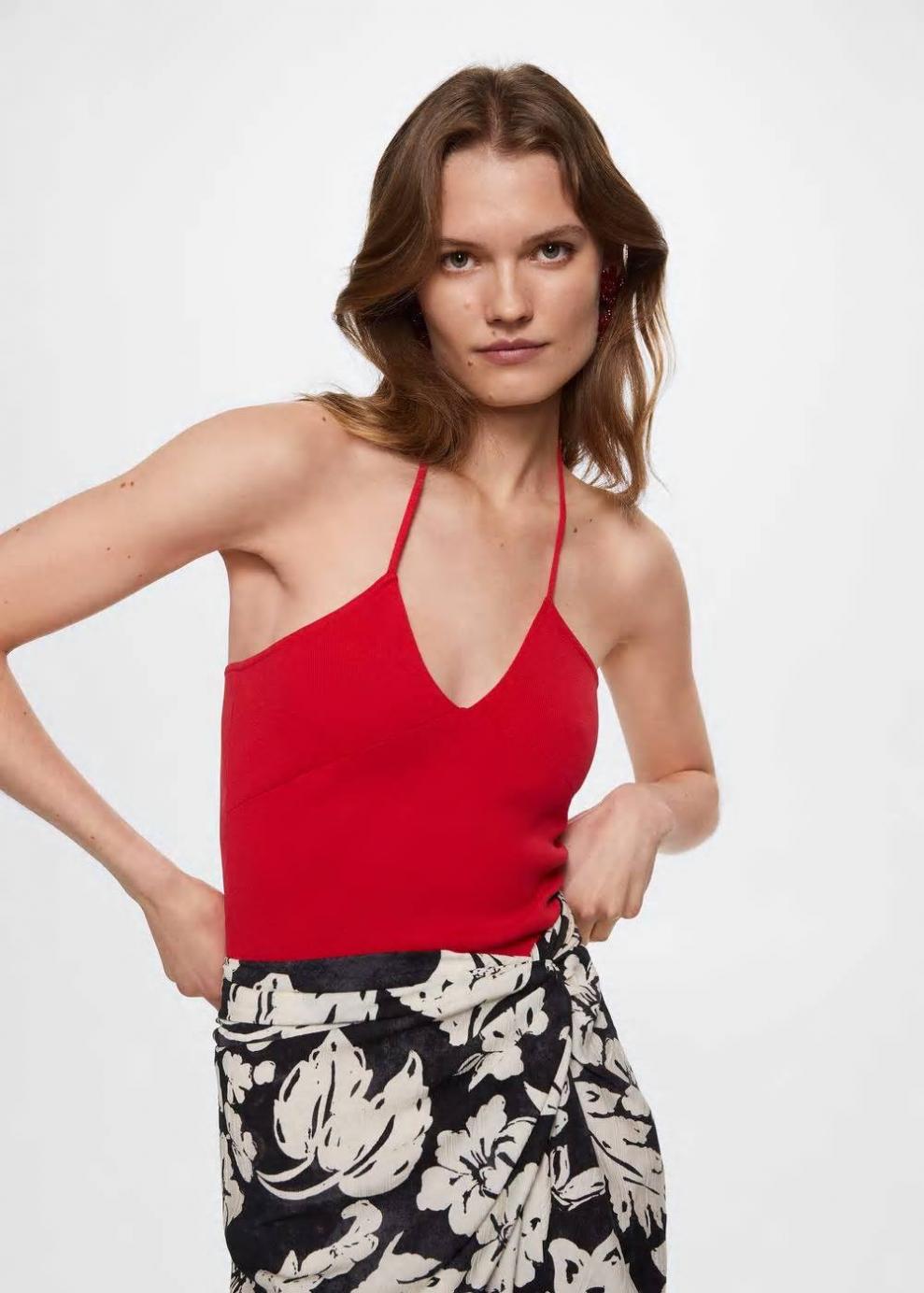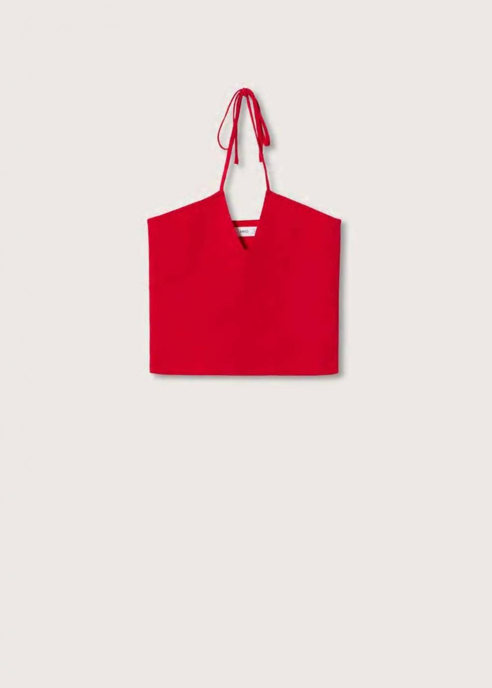 Tejido de punto fino Diseño entallado Diseño crop Cuello pico Tirantes finos Espalda abierta Cierre de lazo en el cuello