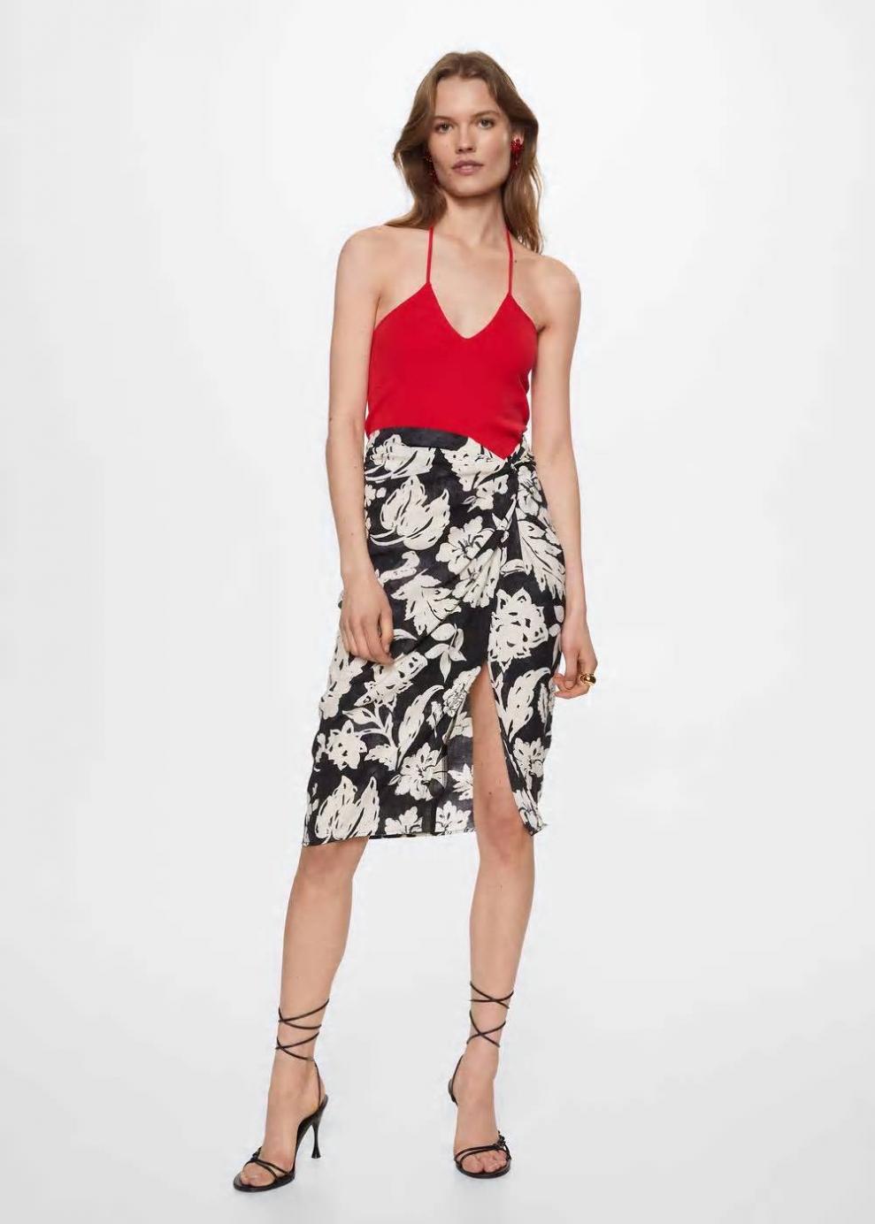 Tejido de punto fino Diseño entallado Diseño crop Cuello pico Tirantes finos Espalda abierta Cierre de lazo en el cuello…