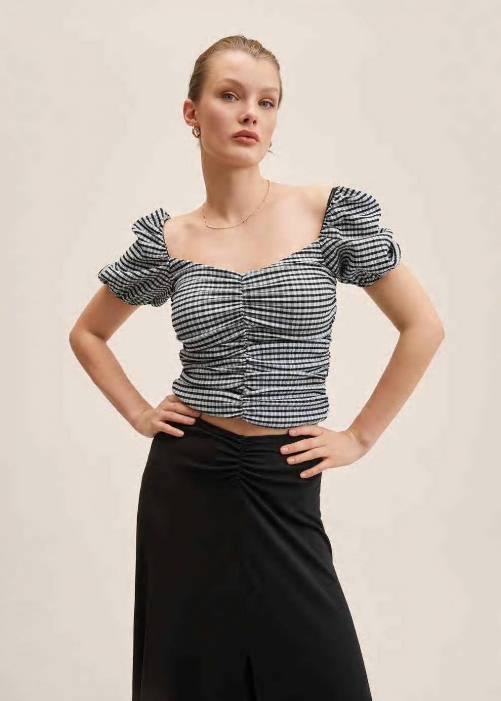 Tejido de poliéster reciclado Estampado cuadro vichy Diseño recto Diseño crop Cuello pico Manga corta abullonada Detalle fruncido Forro interior Cierre lateral de cremallera Disponible Plus