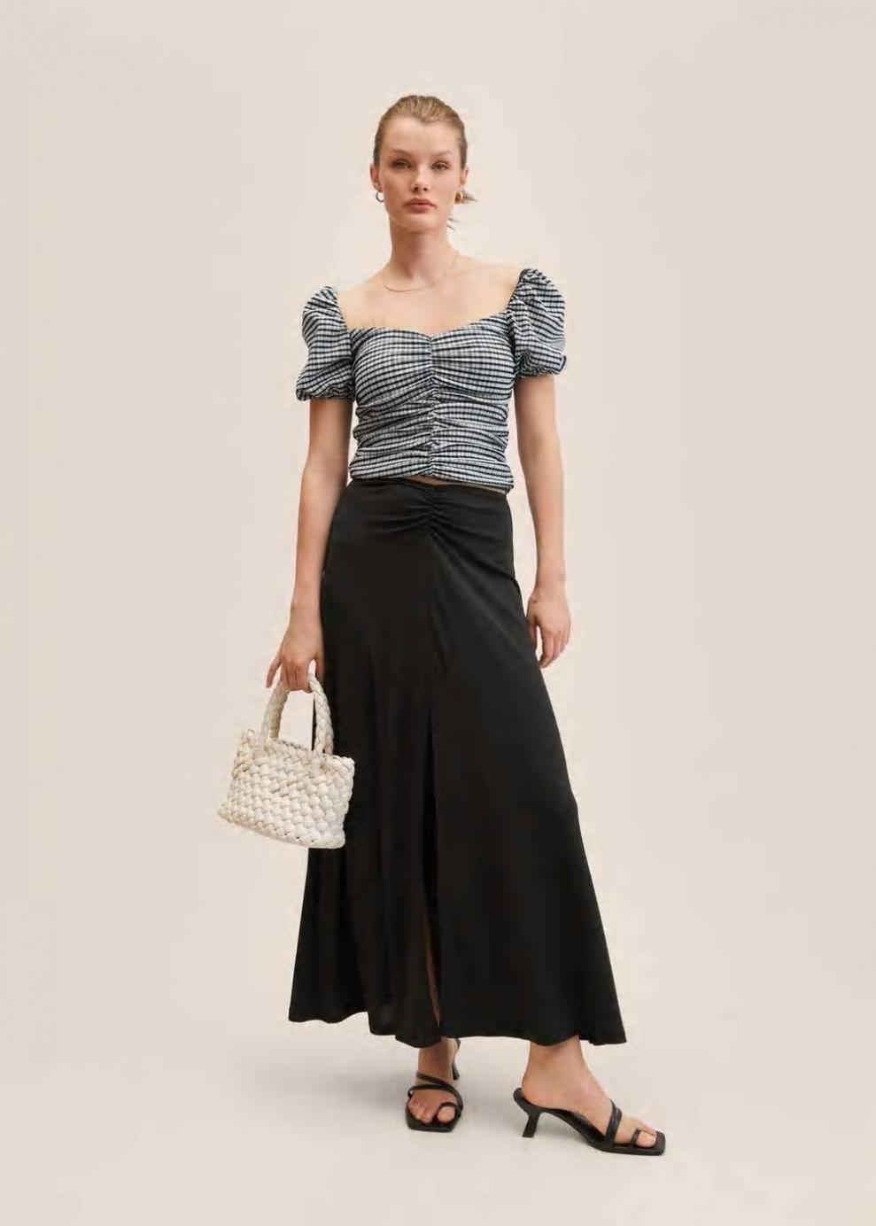 Tejido de poliéster reciclado Estampado cuadro vichy Diseño recto Diseño crop Cuello pico Manga corta abullonada Detalle fruncido Forro interior Cierre lateral de cremallera Disponible Plus…