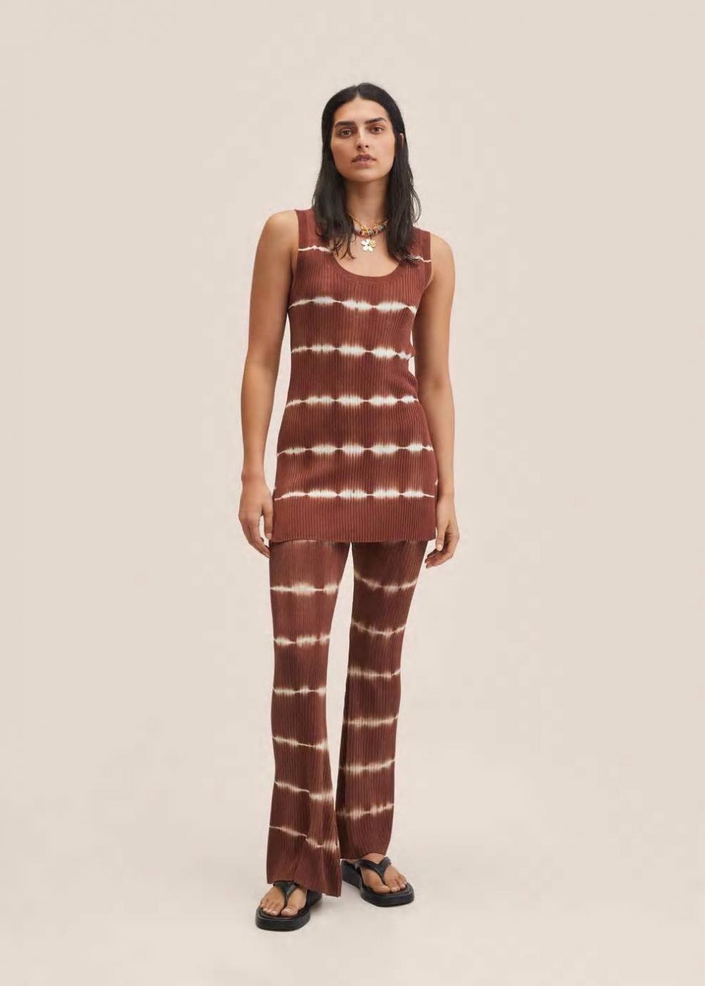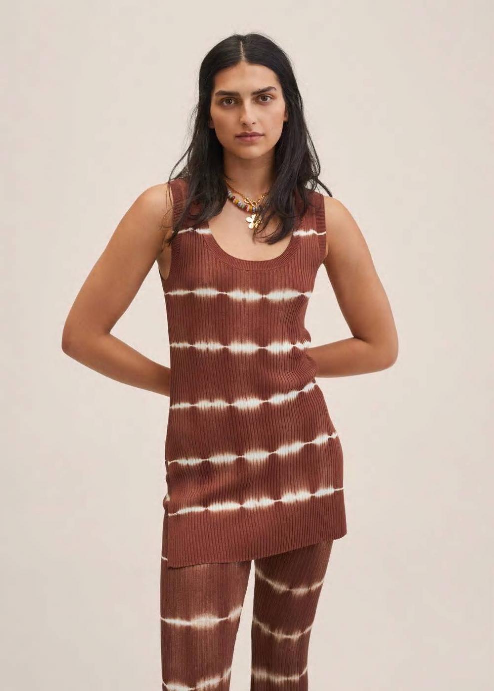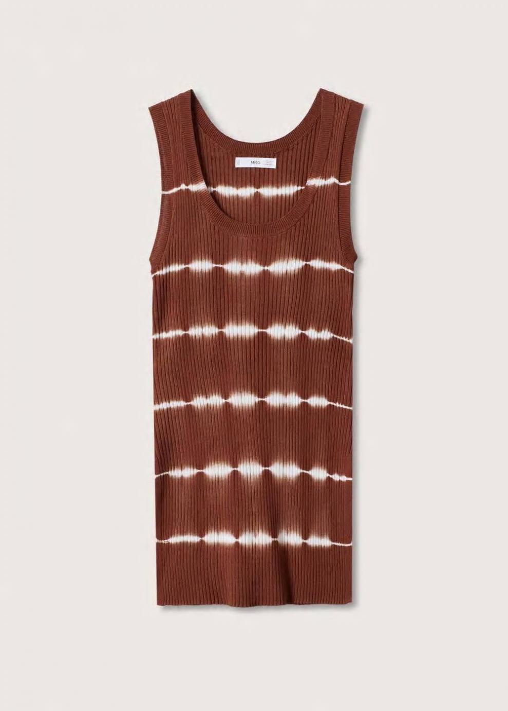 Colección Committed Tejido de punto fino Tejido de canalé Estampado tie-dye Diseño recto Diseño largo Cuello redondo Tirantes anchos Total look Las prendas etiquetadas como Committed son productos que han sido confeccionadas con fibras y/o procesos de producción sostenible, reduciendo así su impacto ambiental. El objetivo de Mango es respaldar la implementación de prácticas más comprometidas con el medio ambiente, aumentando así, el número de prendas sostenibles en su colección.