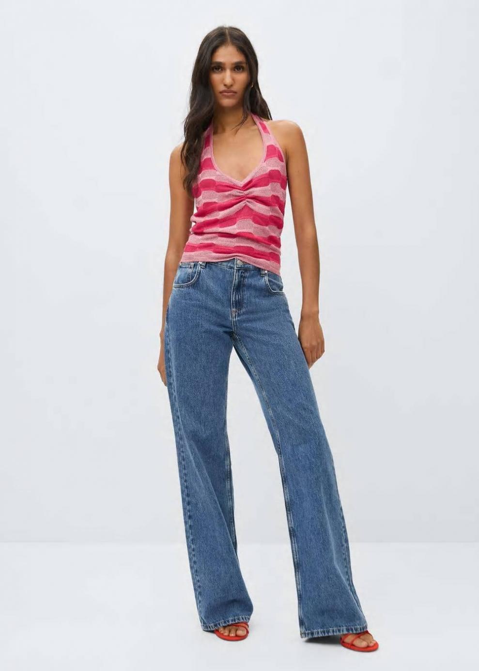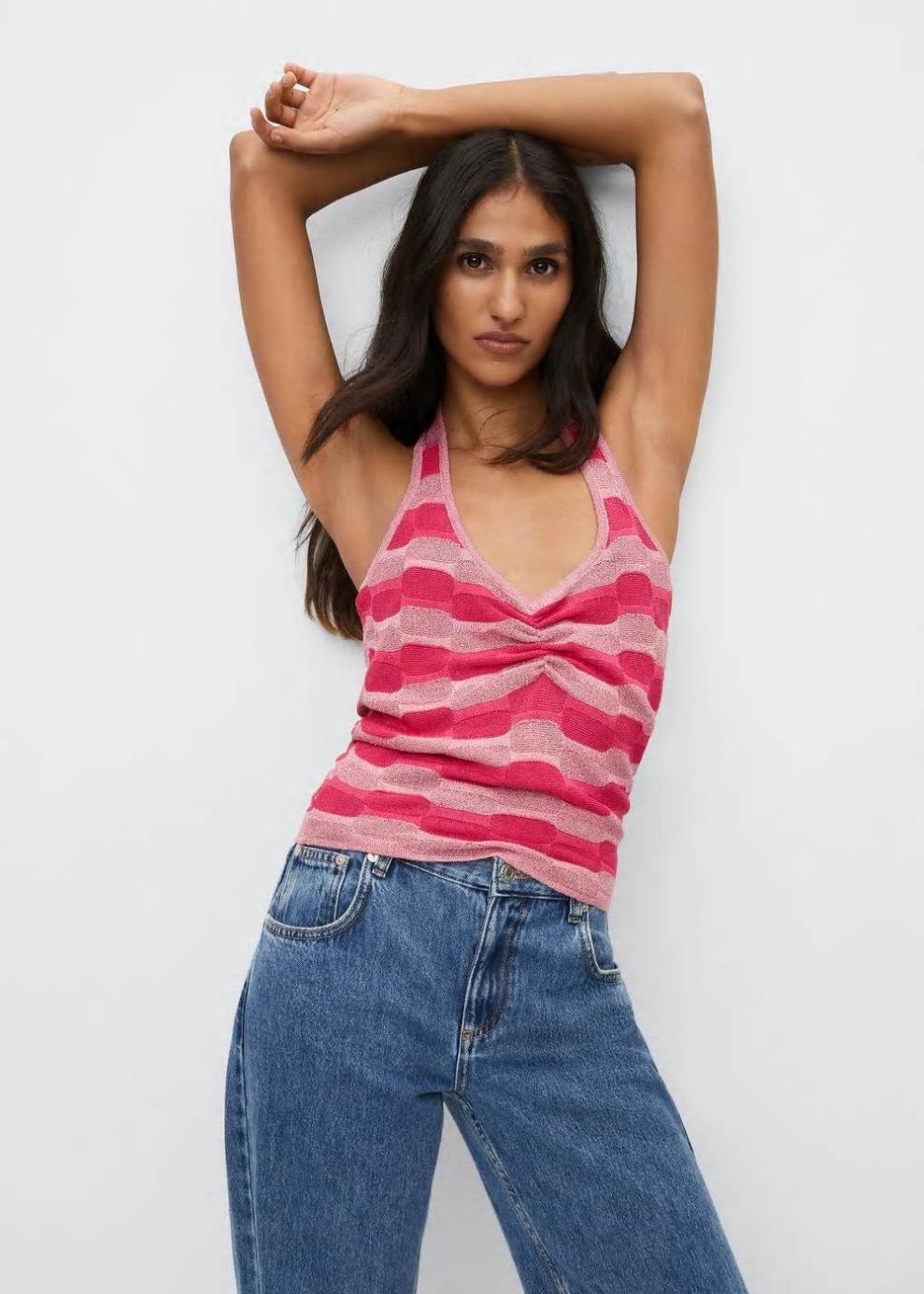 Tejido de punto fino Diseño crop Diseño recto Cuello halter Sin mangas Detalle fruncido en el escote Detalles de lúrex Tirantes anchos Espalda abierta…