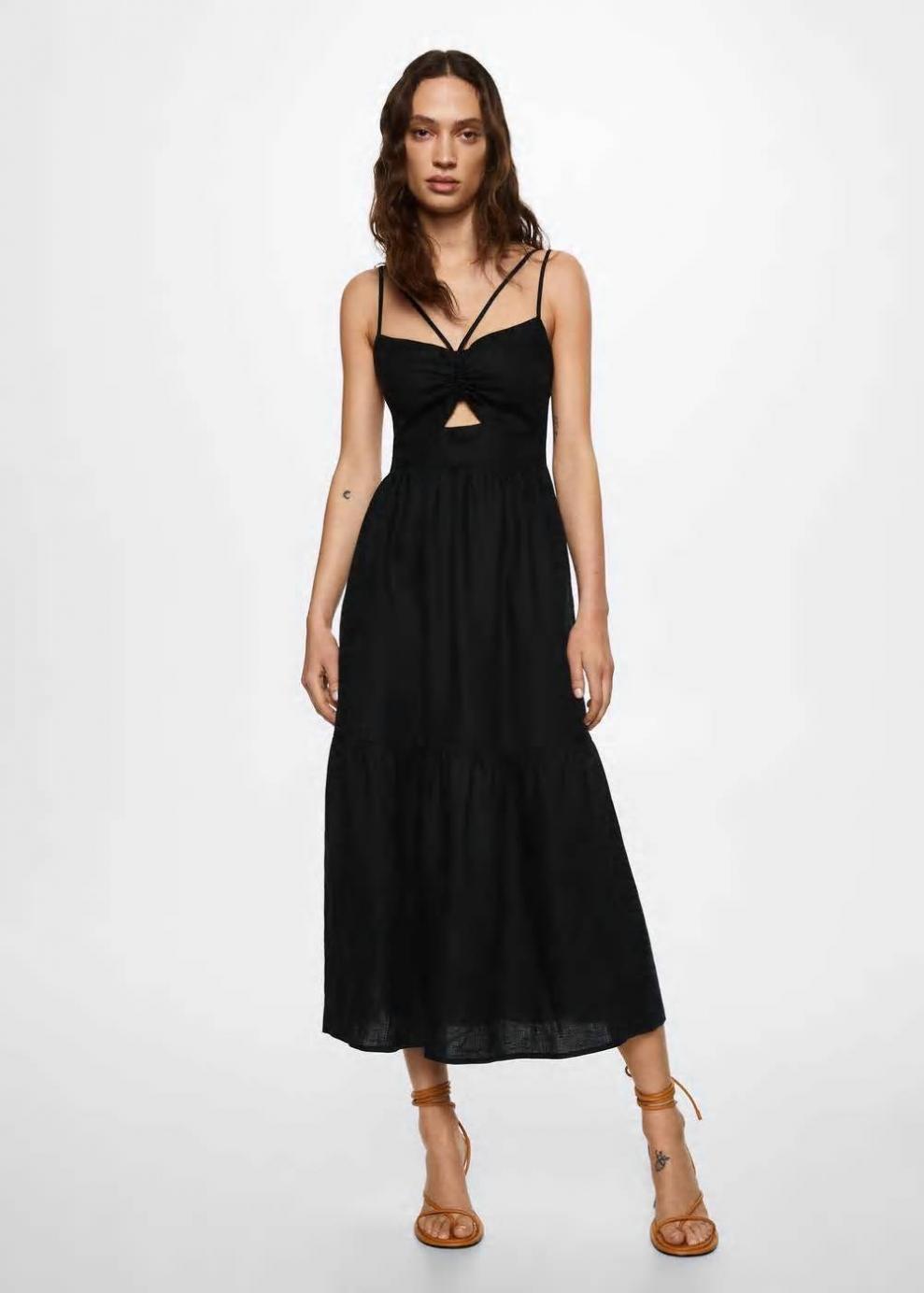 Colección Committed 100% Lino Diseño evasé Diseño largo Cuello escotado Sin mangas Tirantes finos dobles Detalle fruncido en el escote Abertura en la parte delantera Fruncido elástico Dos bolsillos laterales Colección fiesta y ceremonia Las prendas etiquetadas como Committed son productos que han sido confeccionadas con fibras y/o procesos de producción sostenible, reduciendo así su impacto ambiental. El objetivo de Mango es respaldar la implementación de prácticas más comprometidas con el medio ambiente, aumentando así, el número de prendas sostenibles en su colección.