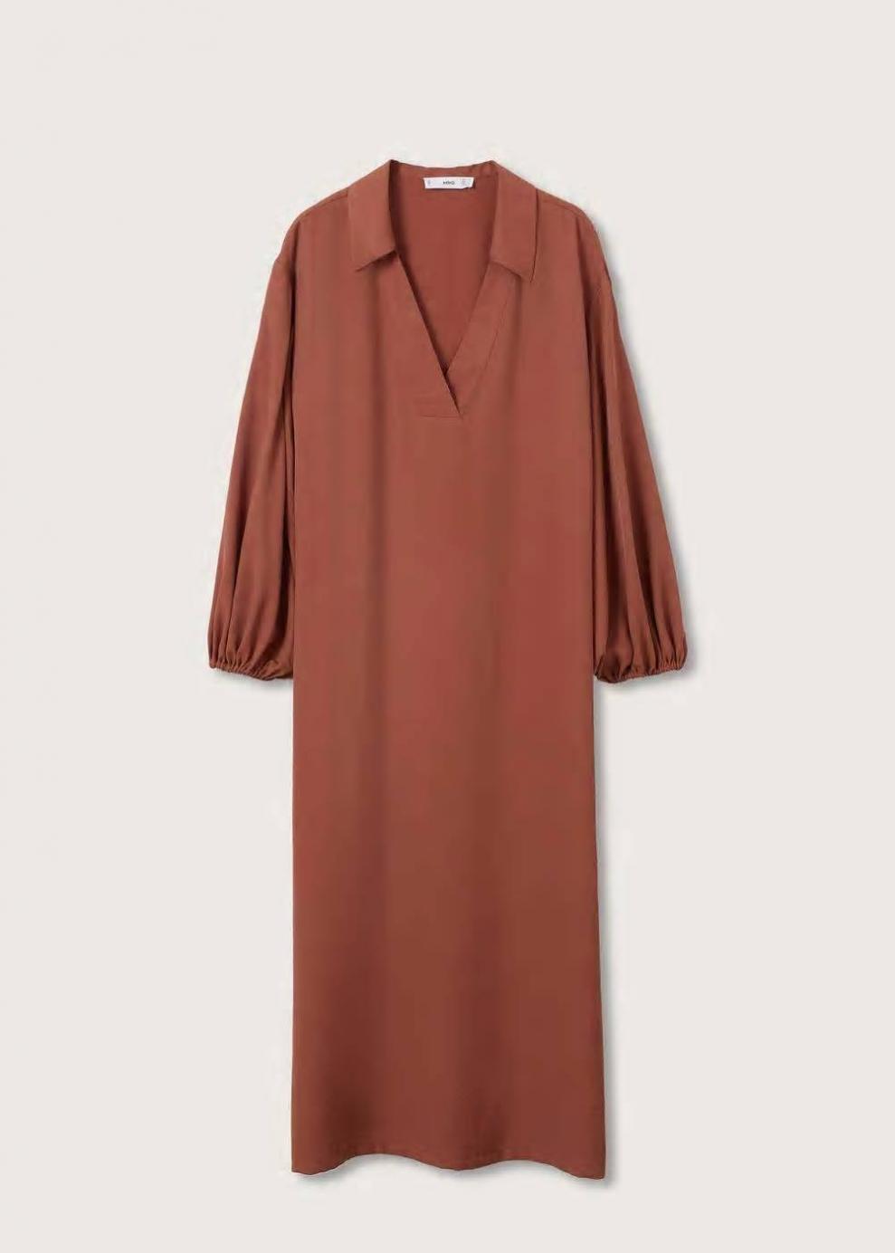 Sin forro interior Manga larga Diseño largo Cuello camisero Sin cierre Tejido fluido Tejido ligero Diseño recto Diseño midi Cuello pico con solapa Manga tres cuartos con puños elásticos R…