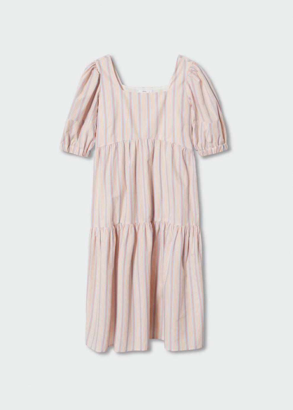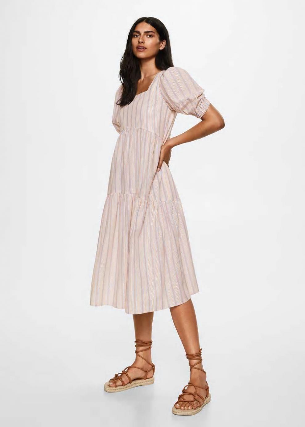 Colección Committed Tejido 100% algodón Tejido fluido Estampado de rayas Detalle de volante Diseño midi Cuello escotado Costuras decorativas Manga corta abullonada Las prendas etiquetadas como Committed son productos que han sido confeccionadas con fibras y/o procesos de producción sostenible, reduciendo así su impacto ambiental. El objetivo de Mango es respaldar la implementación de prácticas más comprometidas con el medio ambiente, aumentando así, el número de prendas sostenibles en su colección.