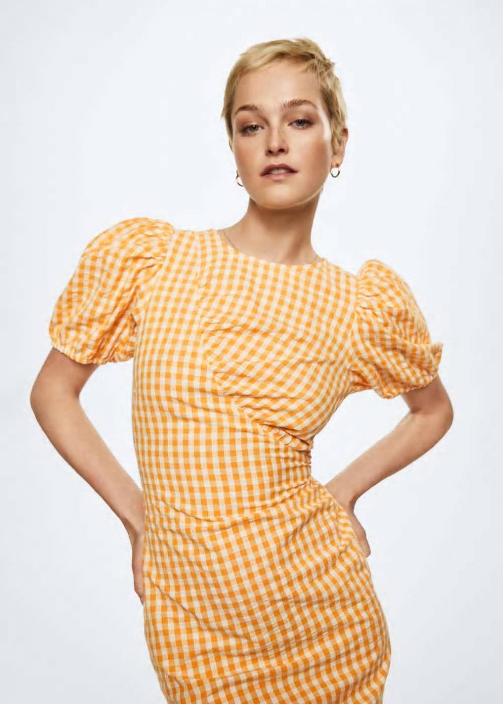 100% Algodón Estampado cuadro vichy Diseño corto Diseño entallado Cuello redondo Manga corta abullonada Detalle fruncido Abertura posterior Cierre de botón en el cuello