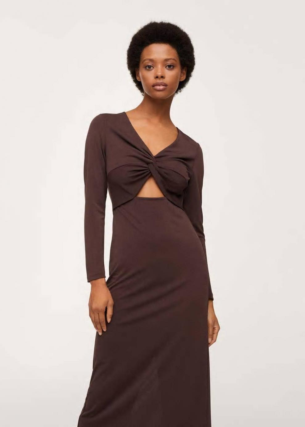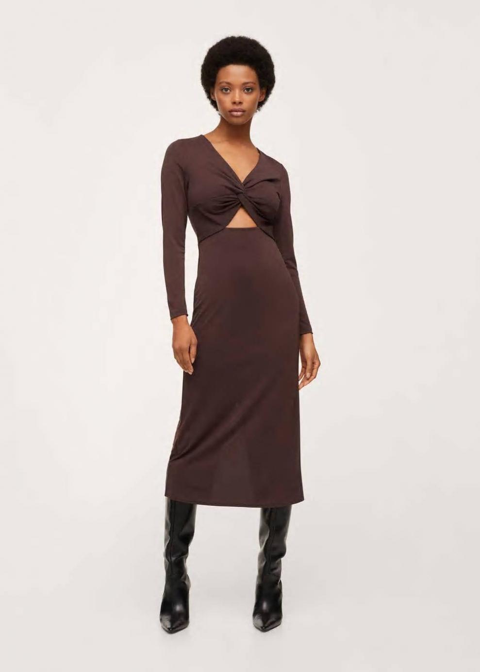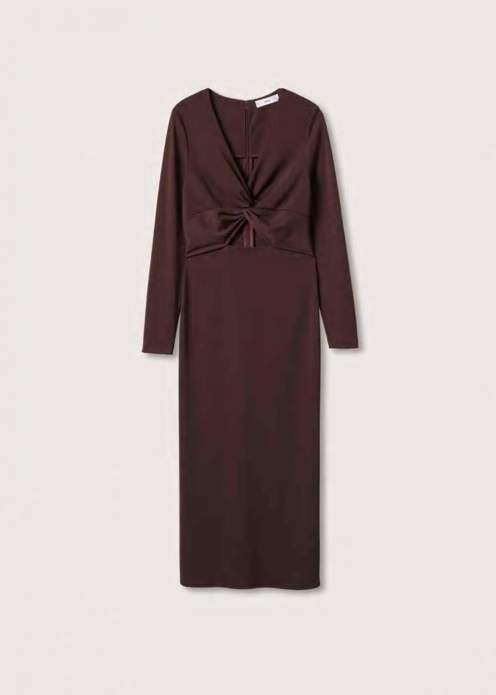 Tejido fluido Diseño midi Diseño entallado Cuello pico Detalle nudo Abertura en la parte delantera Manga larga Abertura posterior en el bajo Cierre de cremallera en la parte posterior