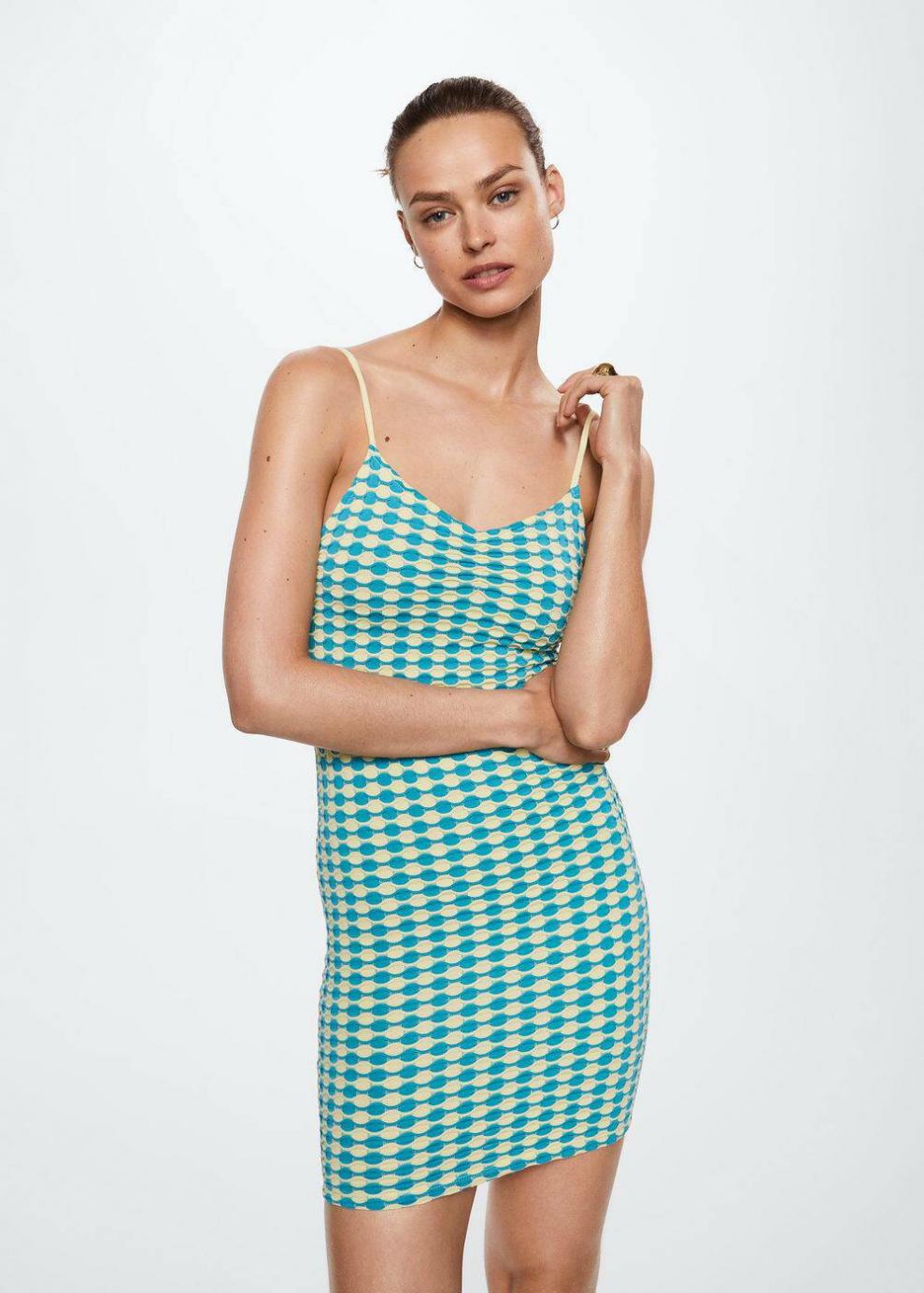 Colección Committed Tejido elástico Tejido con textura Diseño corto Diseño entallado Cuello pico Tirantes finos Sin forro interior Colección fiesta y ceremonia Las prendas etiquetadas como Committed son productos que han sido confeccionadas con fibras y/o procesos de producción sostenible, reduciendo así su impacto ambiental. El objetivo de Mango es respaldar la implementación de prácticas más comprometidas con el medio ambiente, aumentando así, el número de prendas sostenibles en su colección.