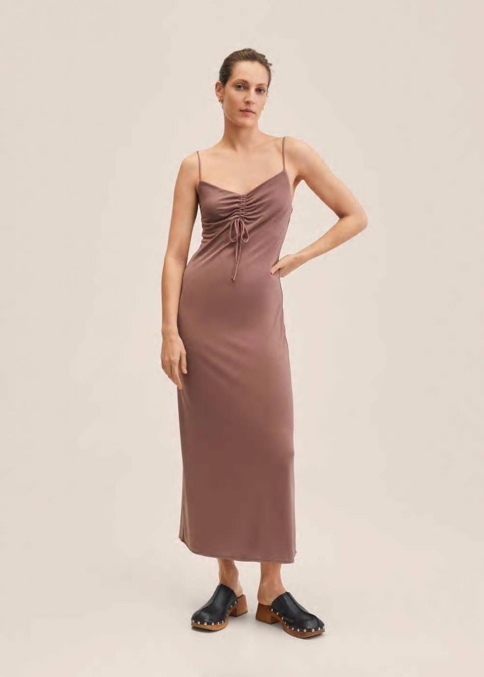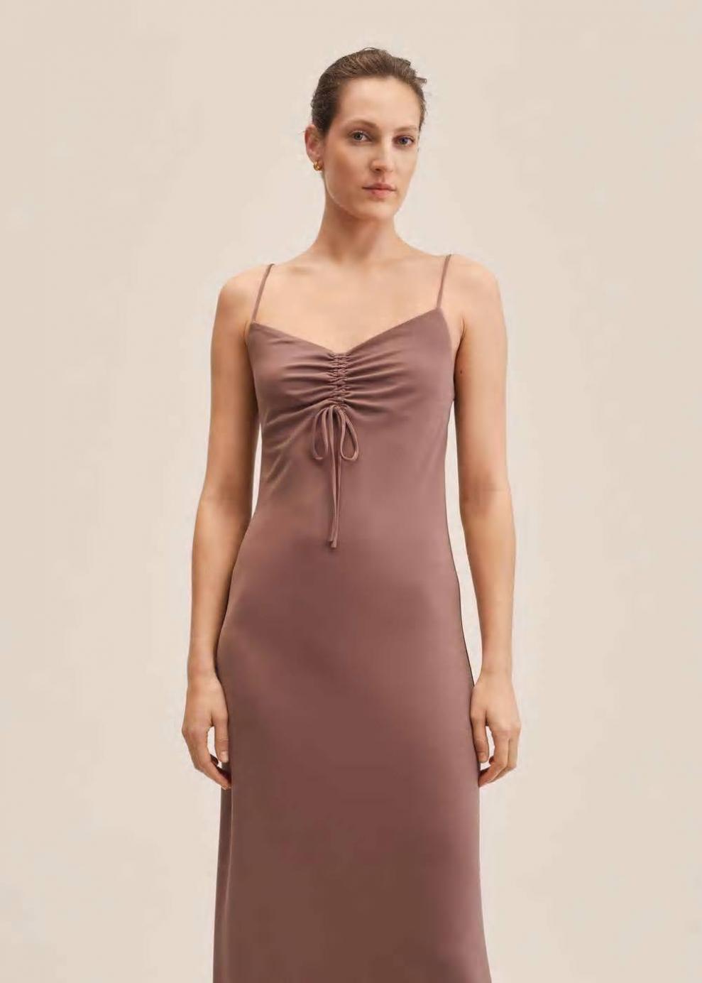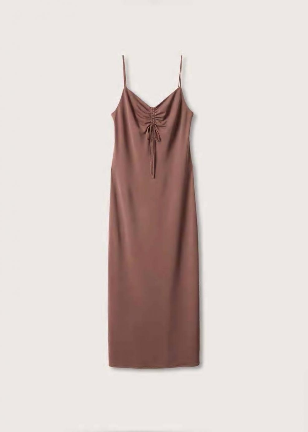 Tejido fluido Diseño recto Diseño largo Cuello escotado Detalle fruncido en el escote Tirantes finos Sin mangas Abertura posterior en el bajo Colección fiesta y ceremonia